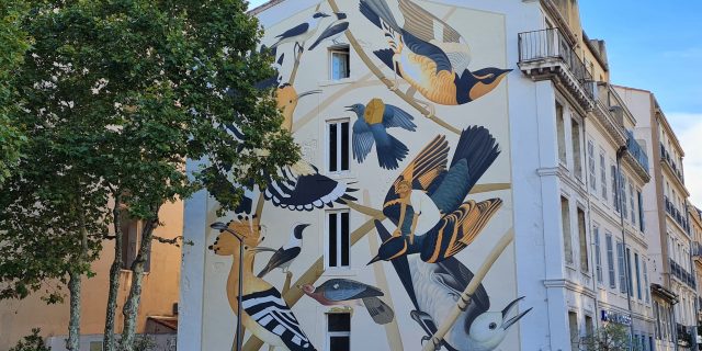 The latter is the work of the Greek artist Fikos. His monumental work includes Mediterranean migratory birds (The Tricky Ear, a black and white passerine, the hoopoe fasciata, the blue mound) and American birds (the mountain mockingbird, the american nutcracker). Inspired by the works of the painter Jean-Jacques Audubon, the artist Fikos wanted to pay tribute to Marseille by painting on one of the birds, the Greek navigator and explorer, Pytheas, so dear to Marseille. This work was financed by the Art Climate Transition (ACT) network, whose aim is to make as many people as possible aware of current climate problems. It was produced at the same time as the World Conservation Congress opened in Marseille.