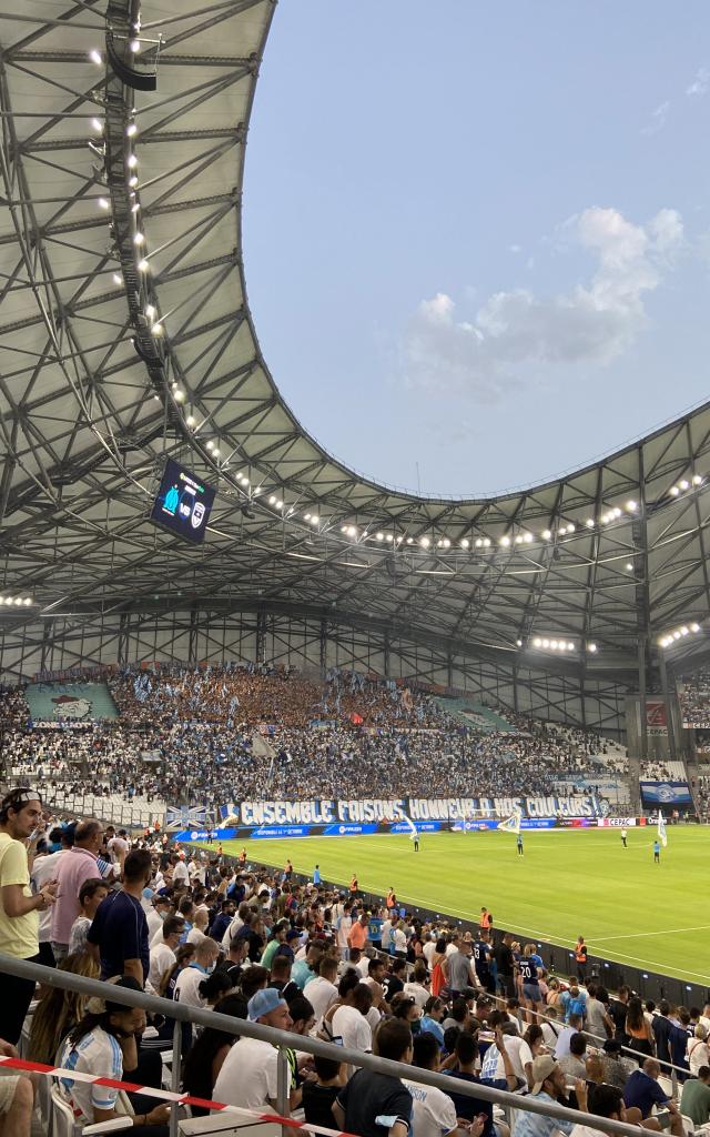 At 8:45 pm, Van Halen’s “Jump” music sounds, the supporters stand up, the fans sing and brandish their tifos with the colours of OM. The match can begin!