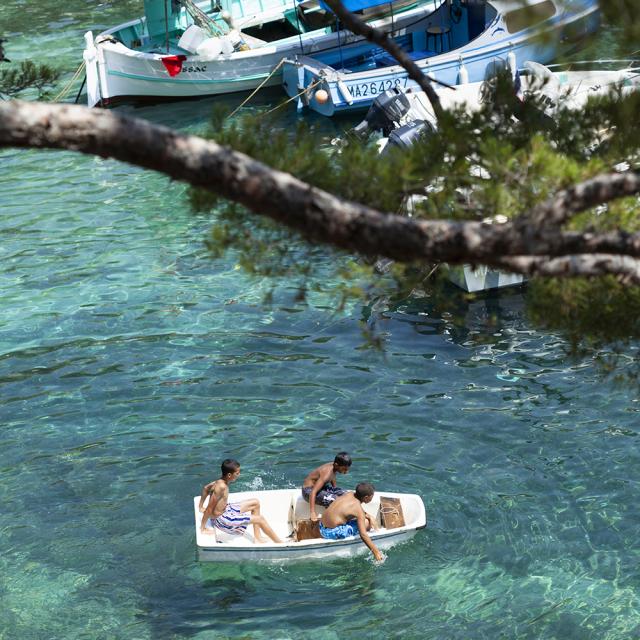 In the distant indentation of the hills, the sea shines, an azure blue that blends with the horizon. The white limestone of the massif is stained with the green of the garrigue and the pine trees, a real palette of three colours. Almost hidden, the small road zigzags down. Watch out for other cars coming up, as there is little space to pass each other!