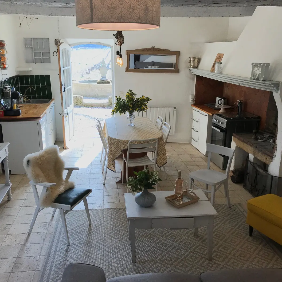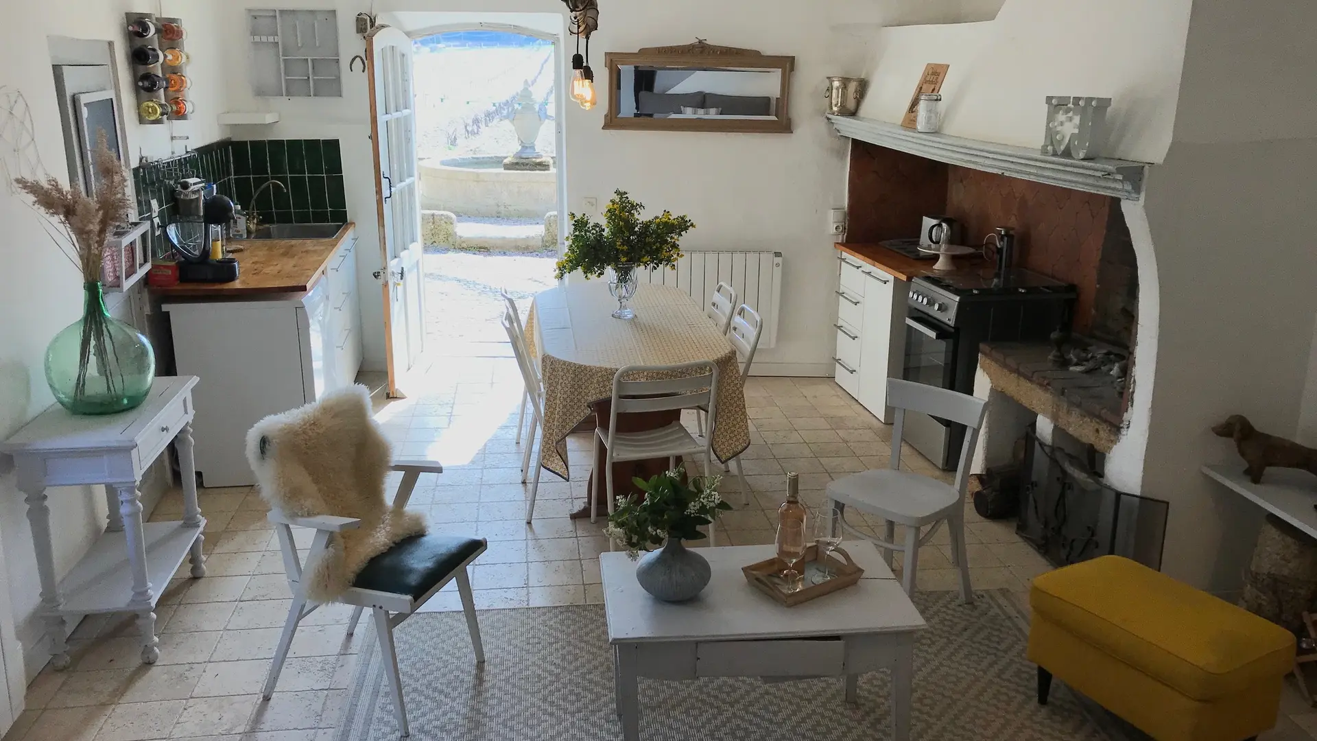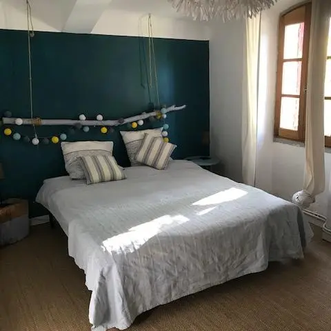 Large living room on ground floor with fitted kitchen. Upstairs, three bedrooms (2 double beds and 1 single bed) + bathroom. Small terrace in the shade of century-old chestnut trees and views over the vineyards, all lulled by the gentle sound of the fountains.