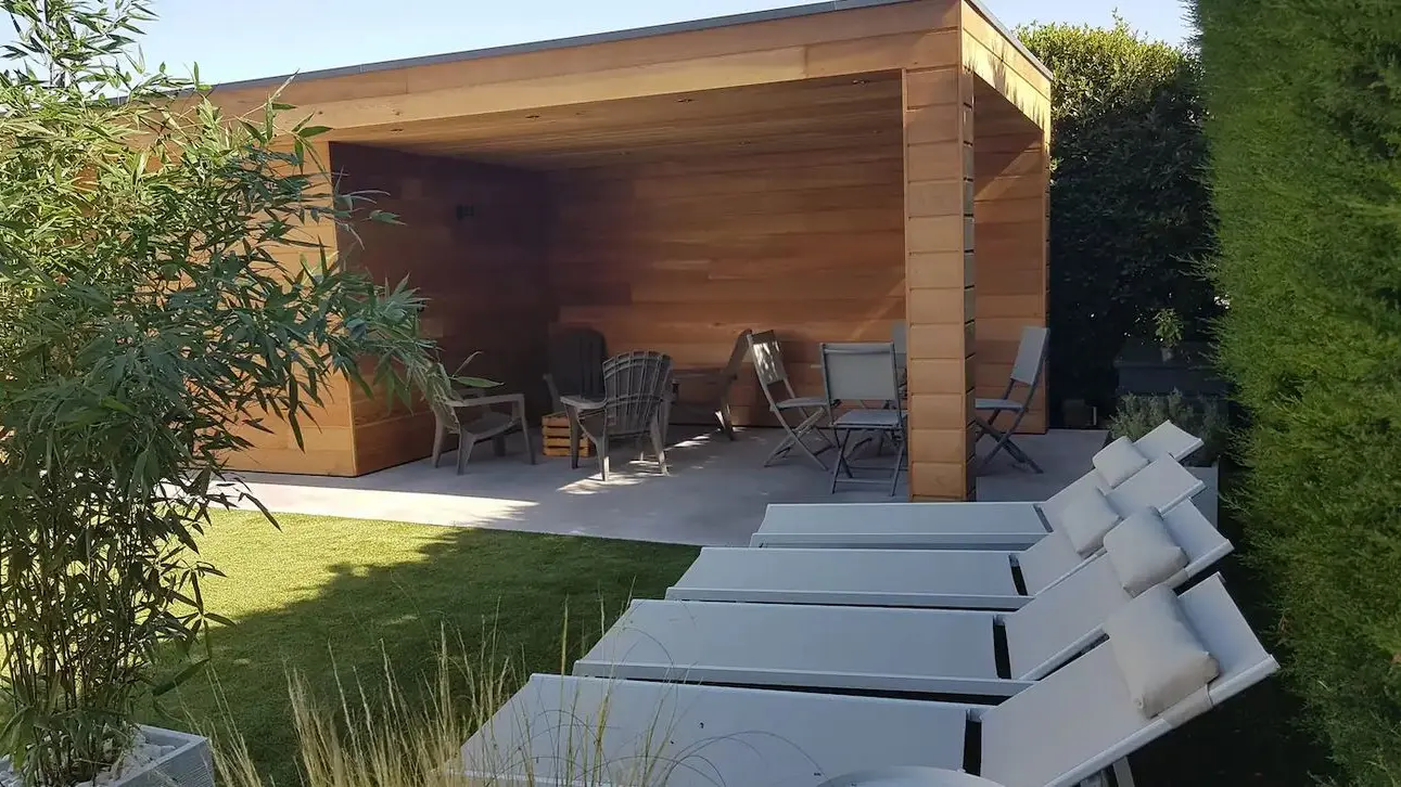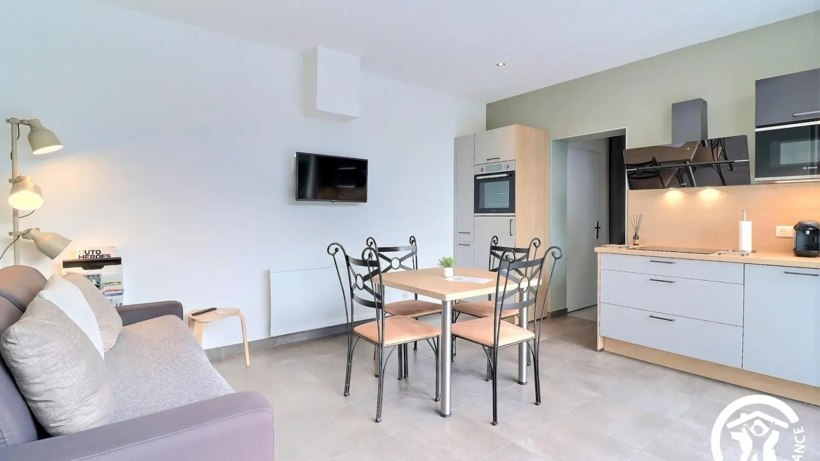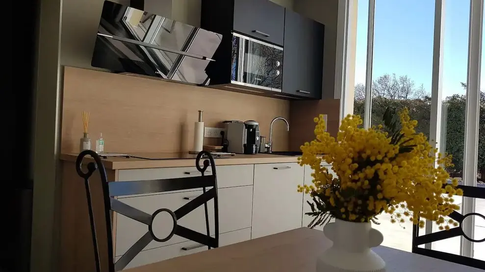 - A bright living room with large bay window overlooking the swimming pool consisting of a dining area for 4 people, an equipped kitchen (oven, fridge with small freezer compartment, 3-burner induction hob, extractor, Tassimo pod coffee maker, micro- microwaves and dishwasher) and a lounge area with convertible sofa (possibility of 2 additional extra beds for children - quality mattress 19cm thick), connected flat screen TV with Netflix access and bright bluetooth speaker.