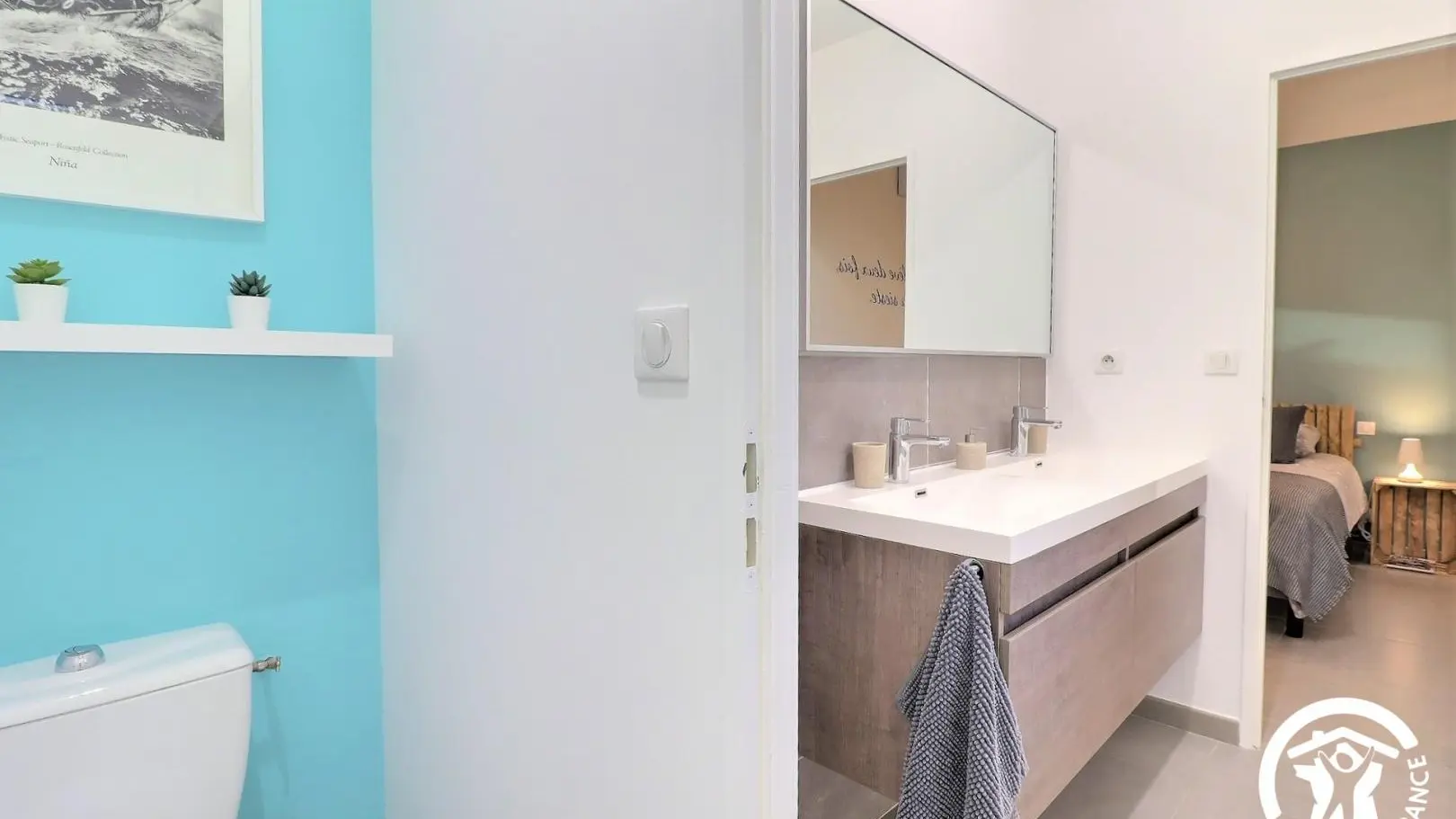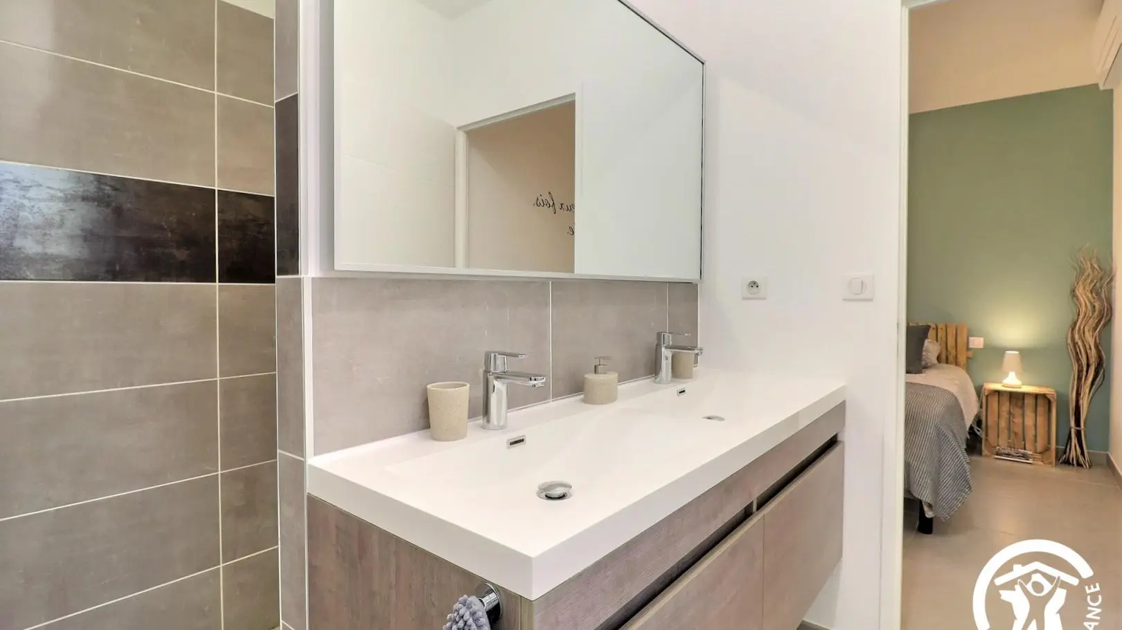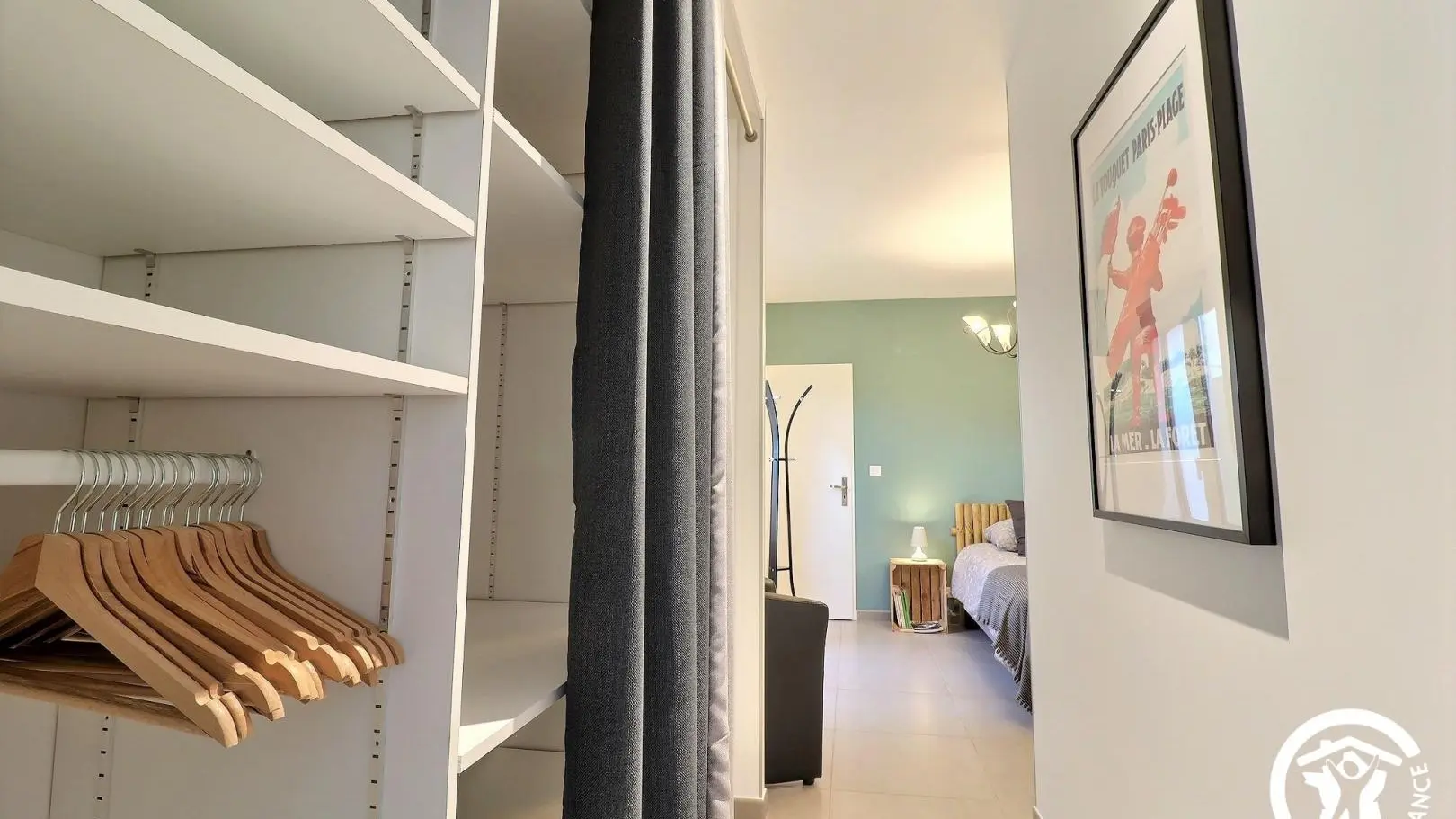 - A bedroom with 1 double bed 160x200cm, an armchair, a large dressing room, a second connected flat screen TV with Netflix access and direct access to the bathroom. Reversible air conditioning and refreshing heated floor.