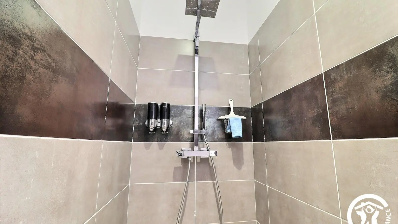 - A bathroom with walk-in shower, shower gel and shampoo dispensers, double basin, heated towel rail and closed toilet.