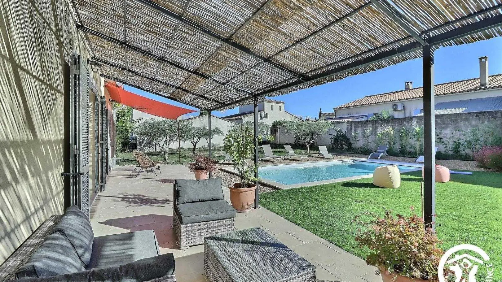 La Bruline is an independent house located near the town center of Saint Rémy de Provence, the Parc des Alpilles and halfway between Avignon and Arles. With its 4 spacious bedrooms, it can accommodate a large family or friends in a pleasant environment conducive to relaxation: summer kitchen and sheltered terrace, swimming pool, pétanque court and ping pong table. The owners have decorated this new house with taste and modernity on the theme of travel: you will be able to note details throughout the rooms such as a globe, a wallpaper world map or framed quotes. On two levels, the house is composed on the ground floor of: