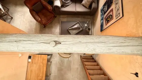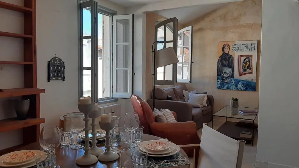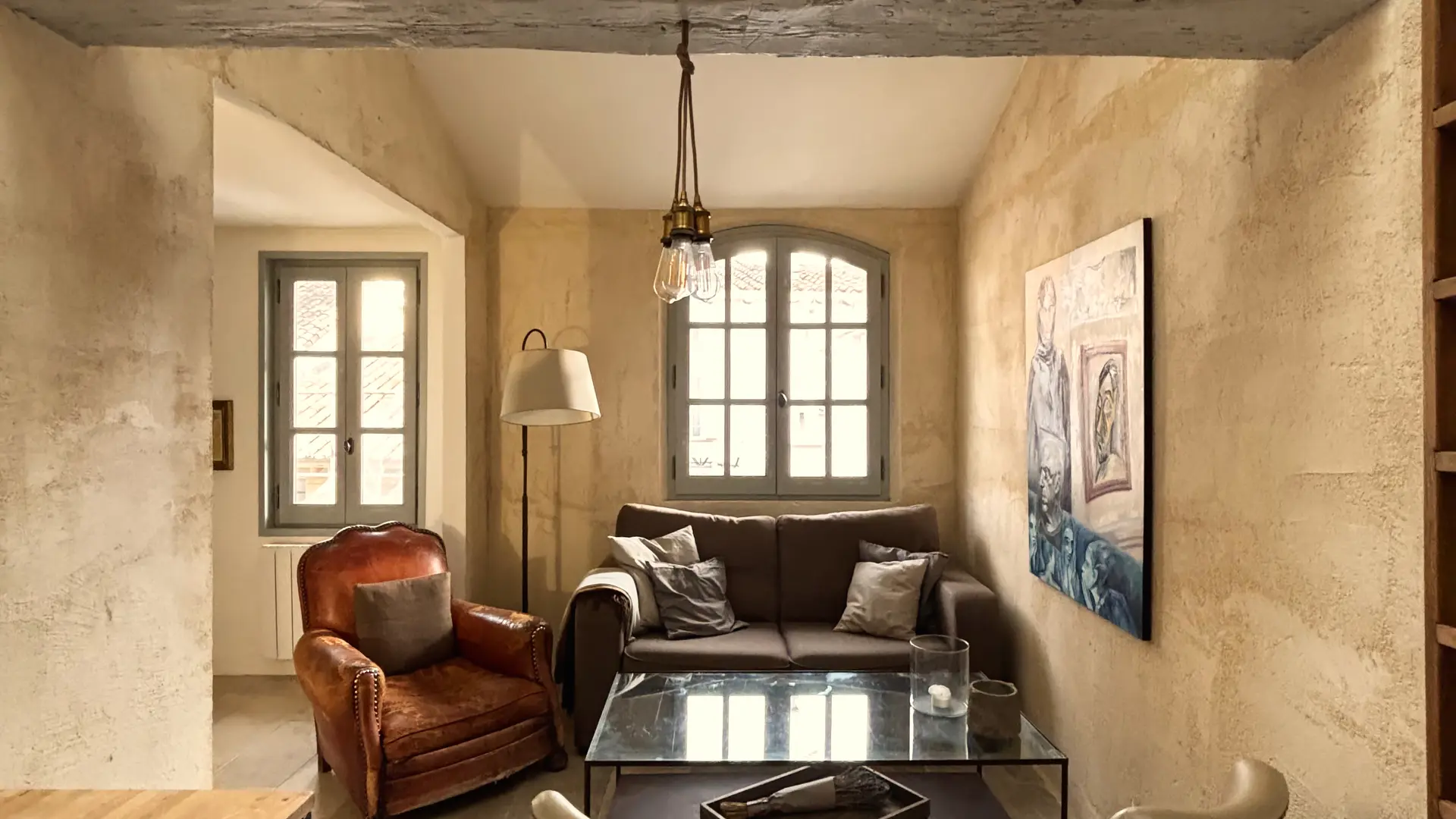 The house has the charm of Arlesian architecture, with its stone walls and exposed wooden beams, large windows, and a central spiral staircase. It is therefore a peaceful place, an invitation to rest and share with loved ones in the comfort of the city center. A table and two chairs in front of the entrance also allow you to linger over a coffee outdoors while enjoying the warm breeze of southern France.