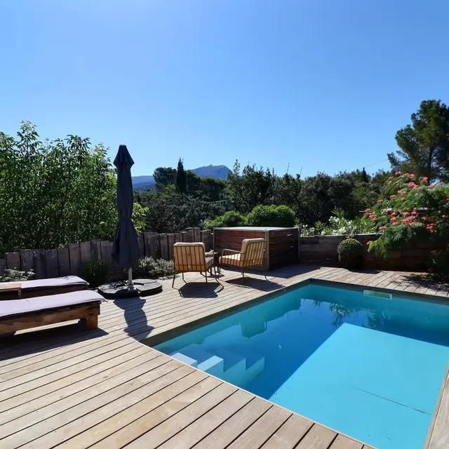 La Petite Maison is a cottage for 4 people at the foot of Sainte-Victoire with a 90m2 garden, terrace and heated swimming pool with beach.