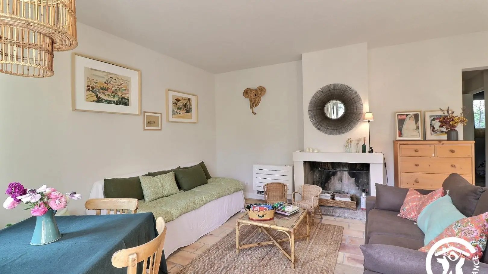 - A living room with two sofas, armchair, coffee table, TV, table with 4 chairs, decorative fireplace, kitchen equipped with a large refrigerator (no freezer), oven, microwave, dishwasher, Nespresso coffee machine, kettle