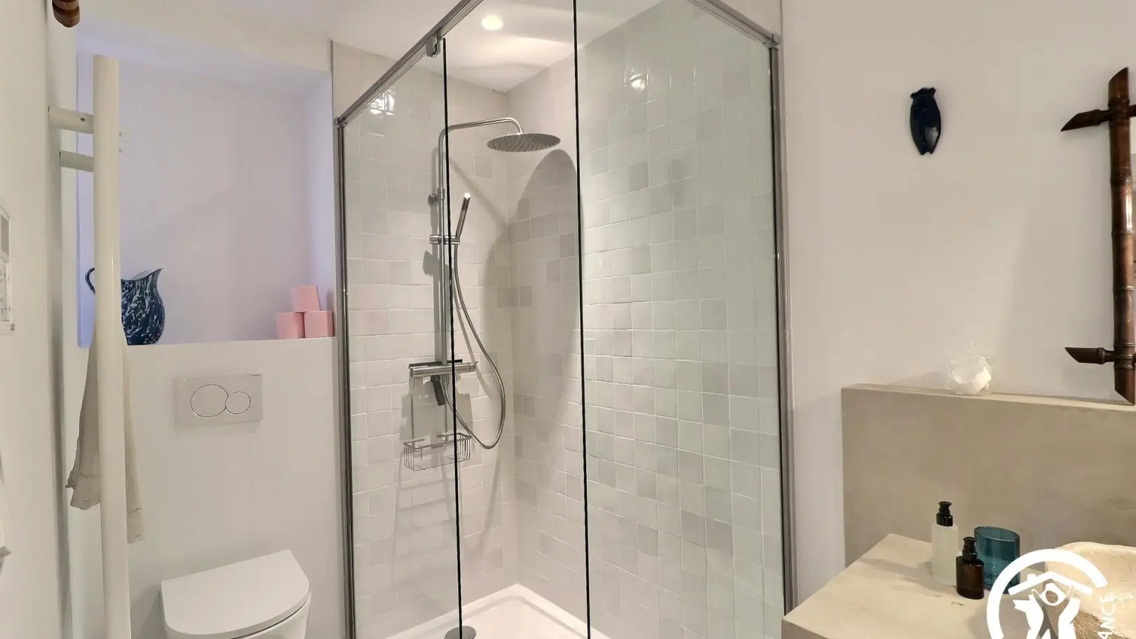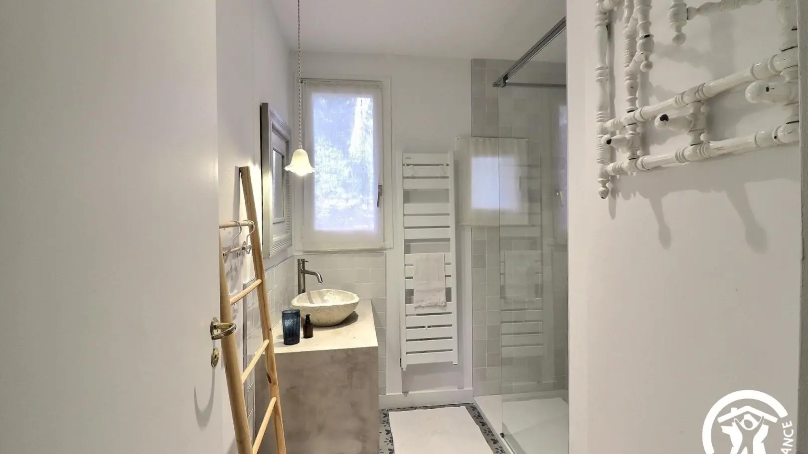 - A bathroom with walk-in shower, vanity unit and heated towel rail