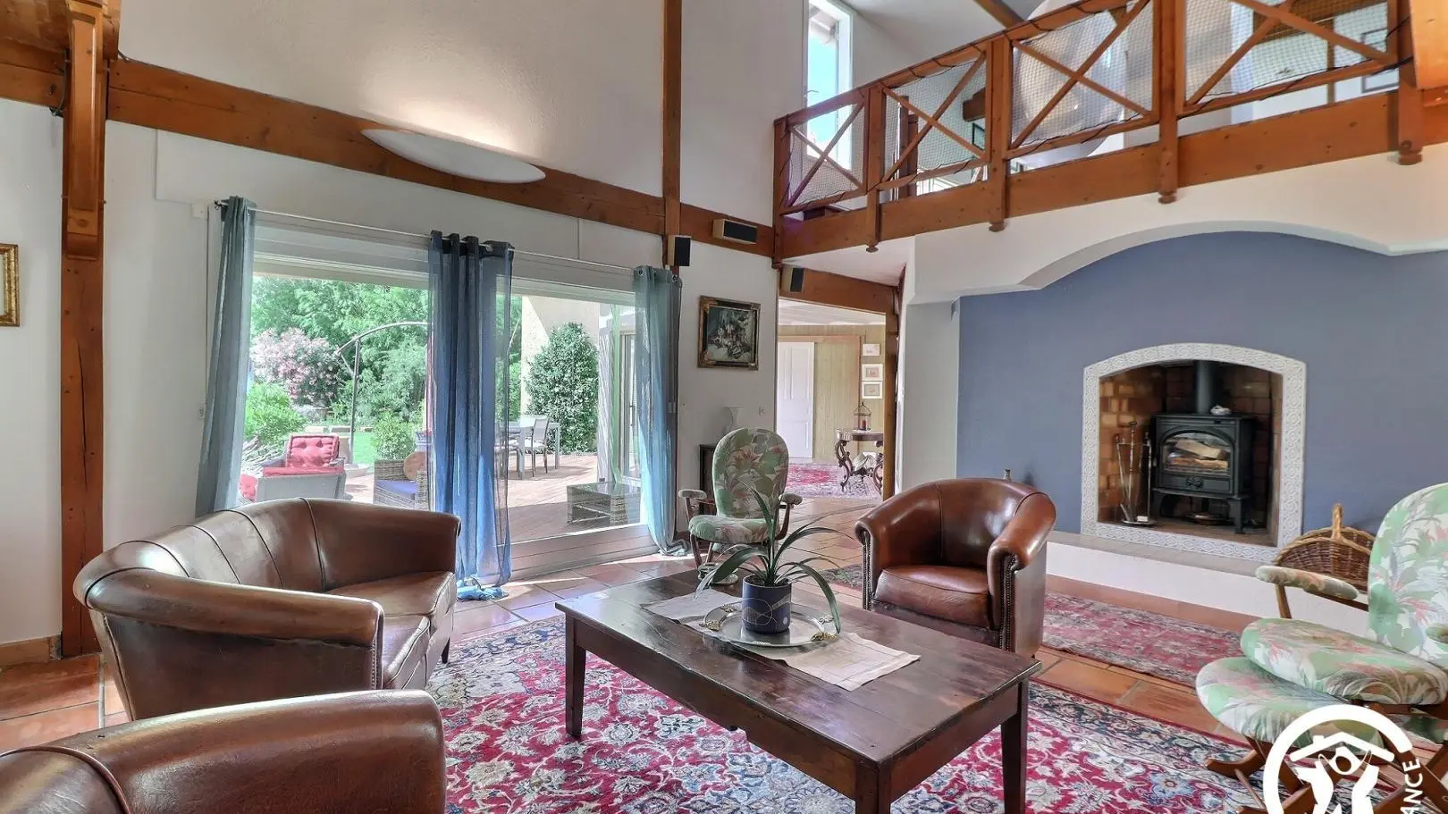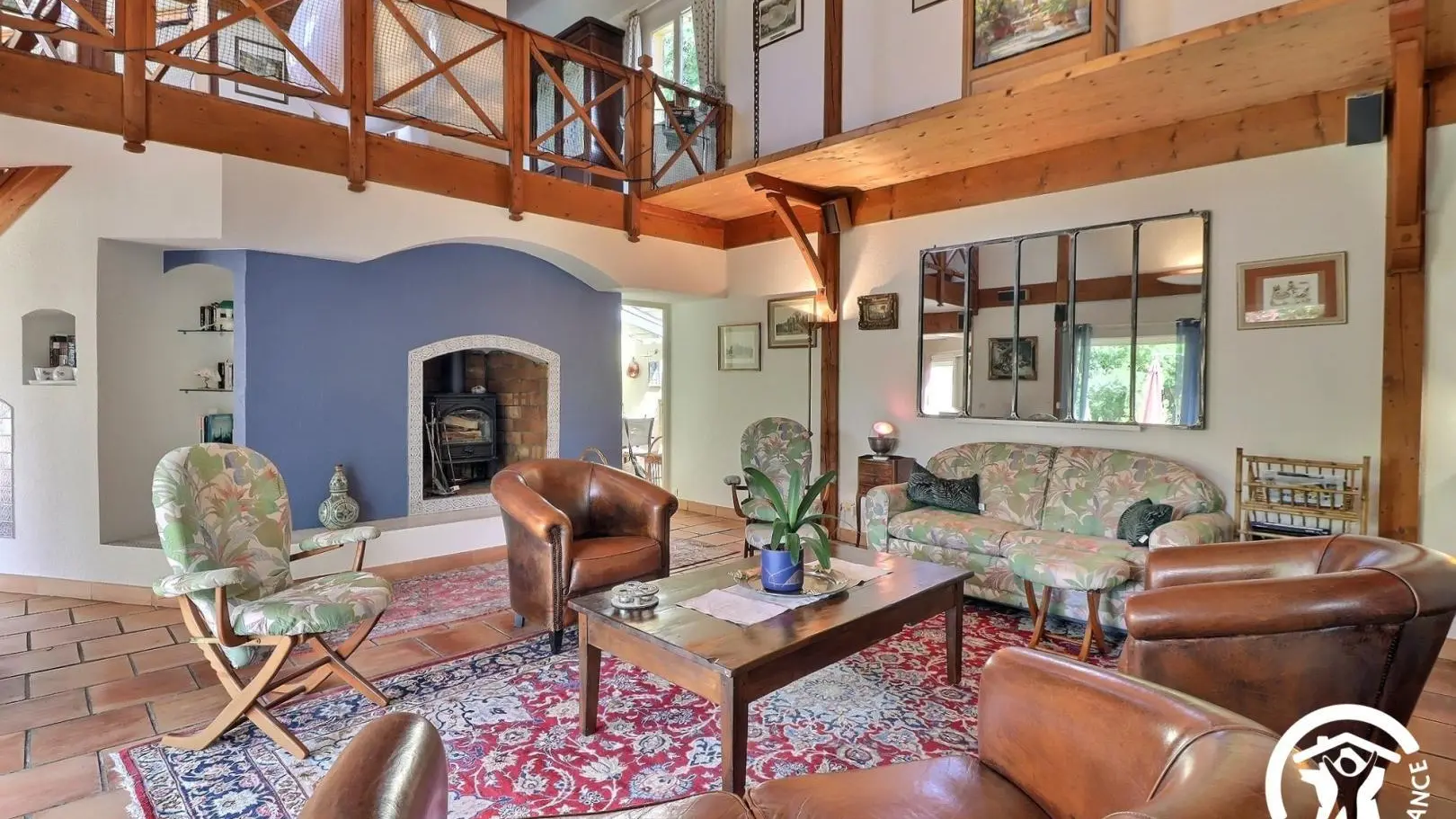 - A large open living room with sofas, armchairs, coffee table, TV and a fireplace for the winter