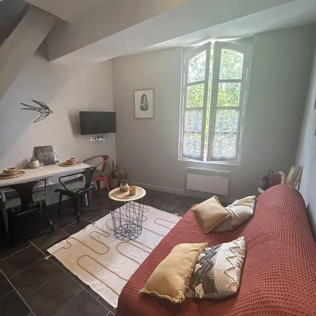 The apartment is on the 2nd floor (no elevator) of a typical building on the Place du Forum.