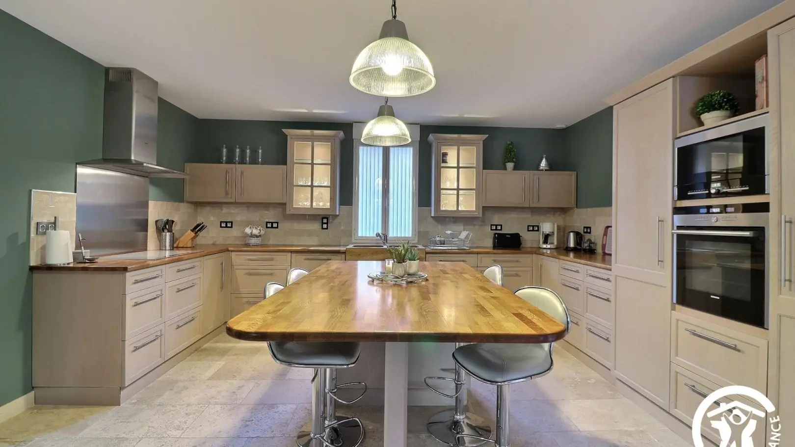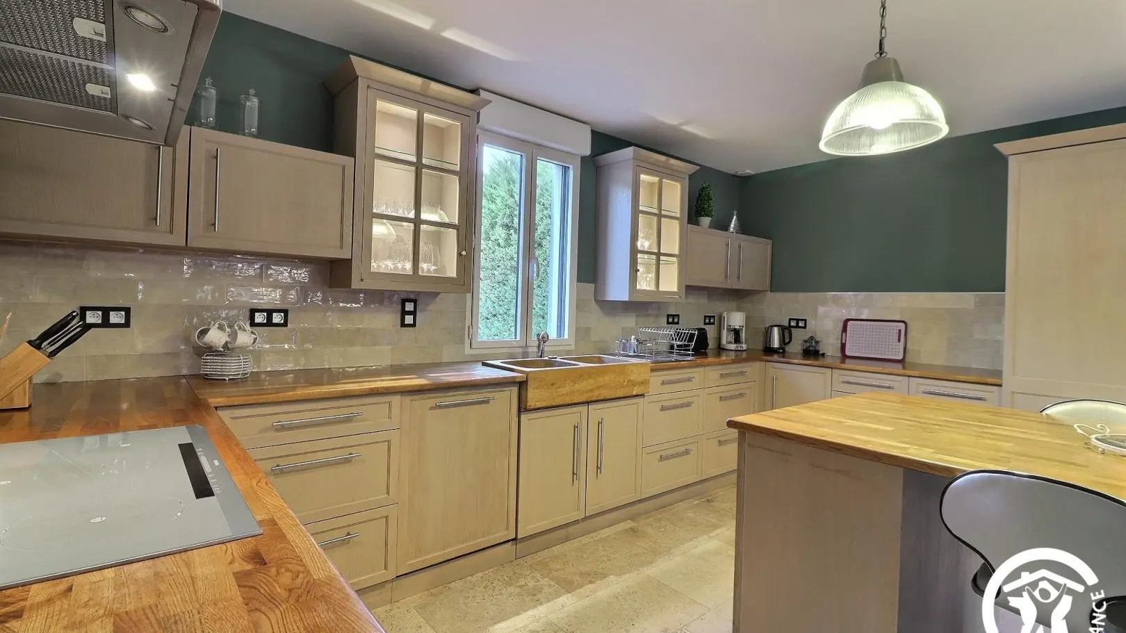 - Kitchen open to the living room with central island with high stools, oven, microwave, 5-burner induction hob, dishwasher, pod coffee maker, stone sink, American fridge/freezer with ice cube dispenser and water fountain.