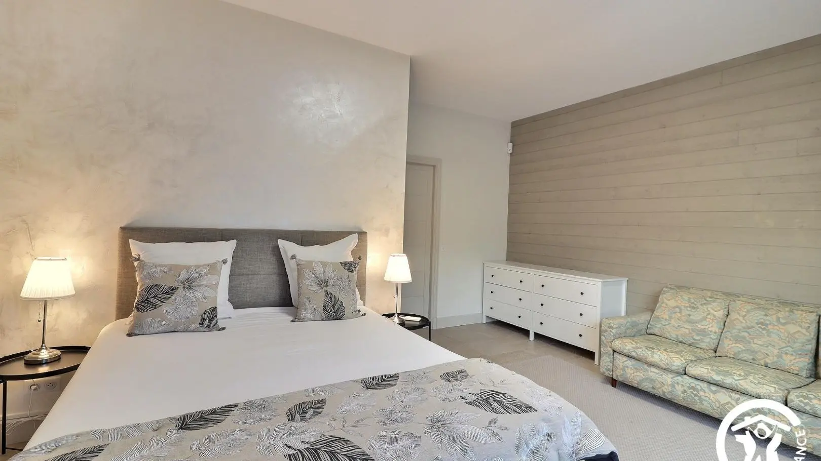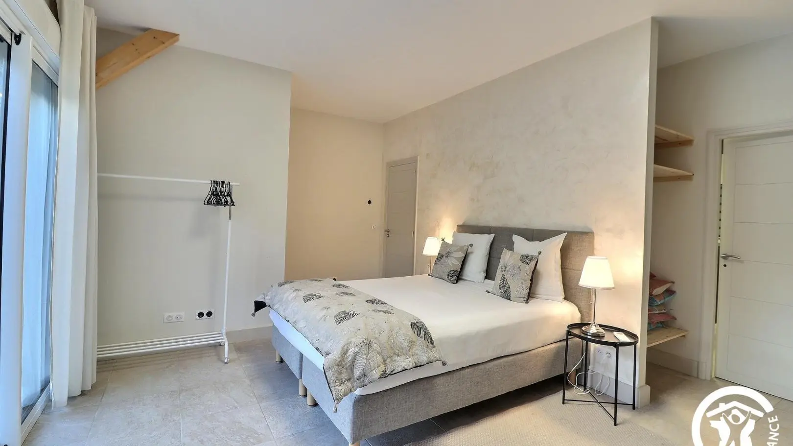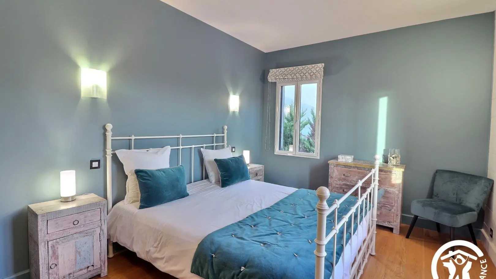 - 2nd bedroom with 1 bed 160x200cm, clothes rack, chest of drawers and 2 armchairs. Bay window overlooking the terrace and the swimming pool, convector fan and full-length mirror.