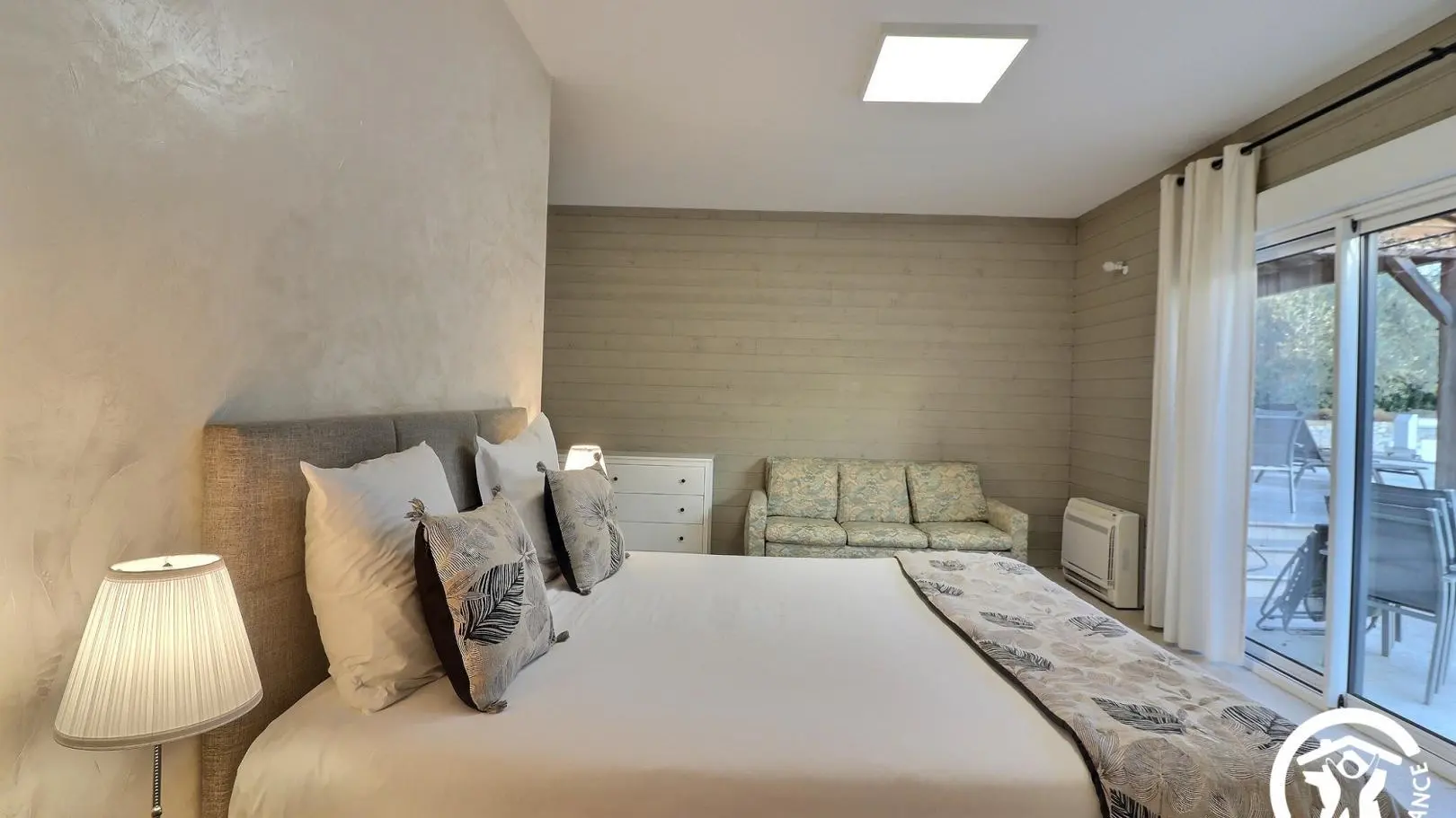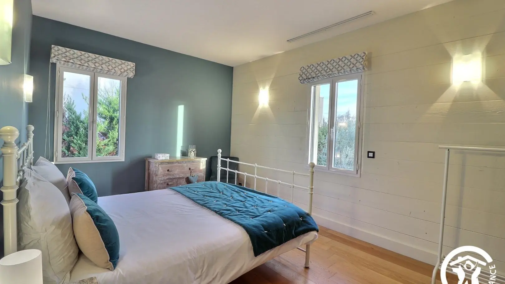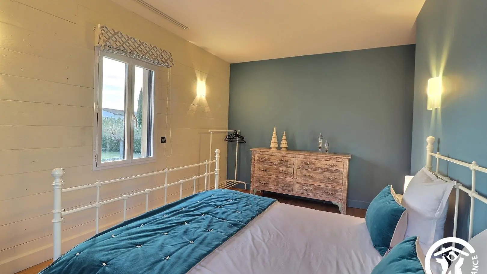 - 1st bedroom with 1 bed 160x200cm, clothes rack and chest of drawers. Bay window overlooking the terrace and the swimming pool, convector fan.