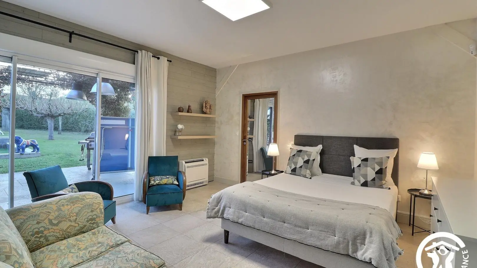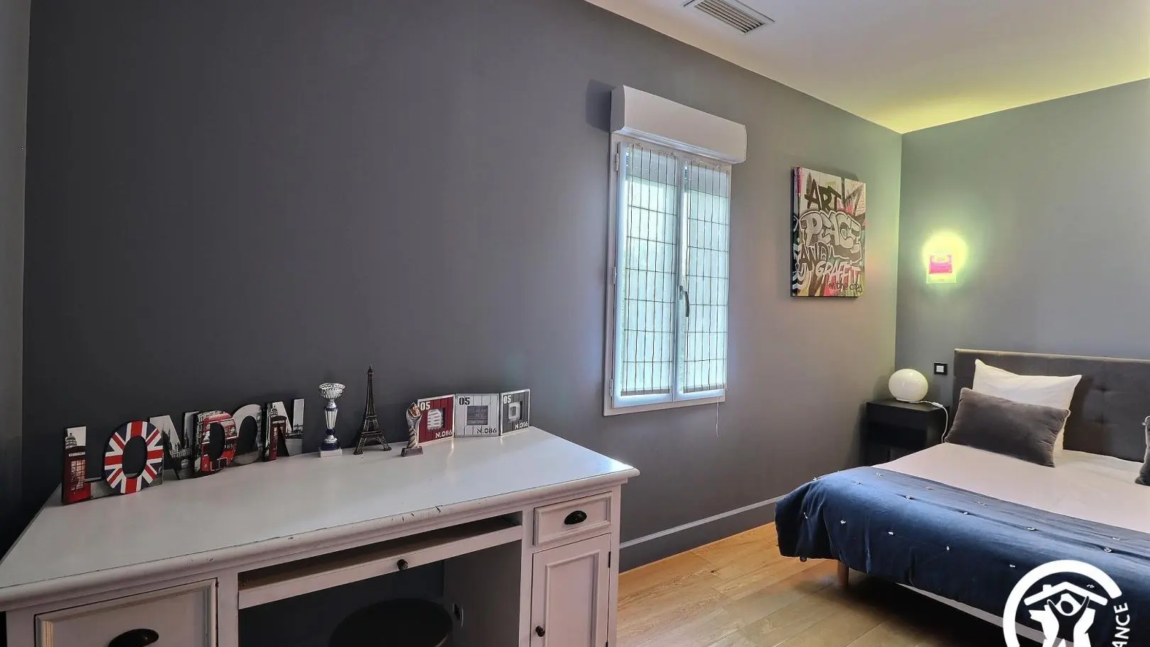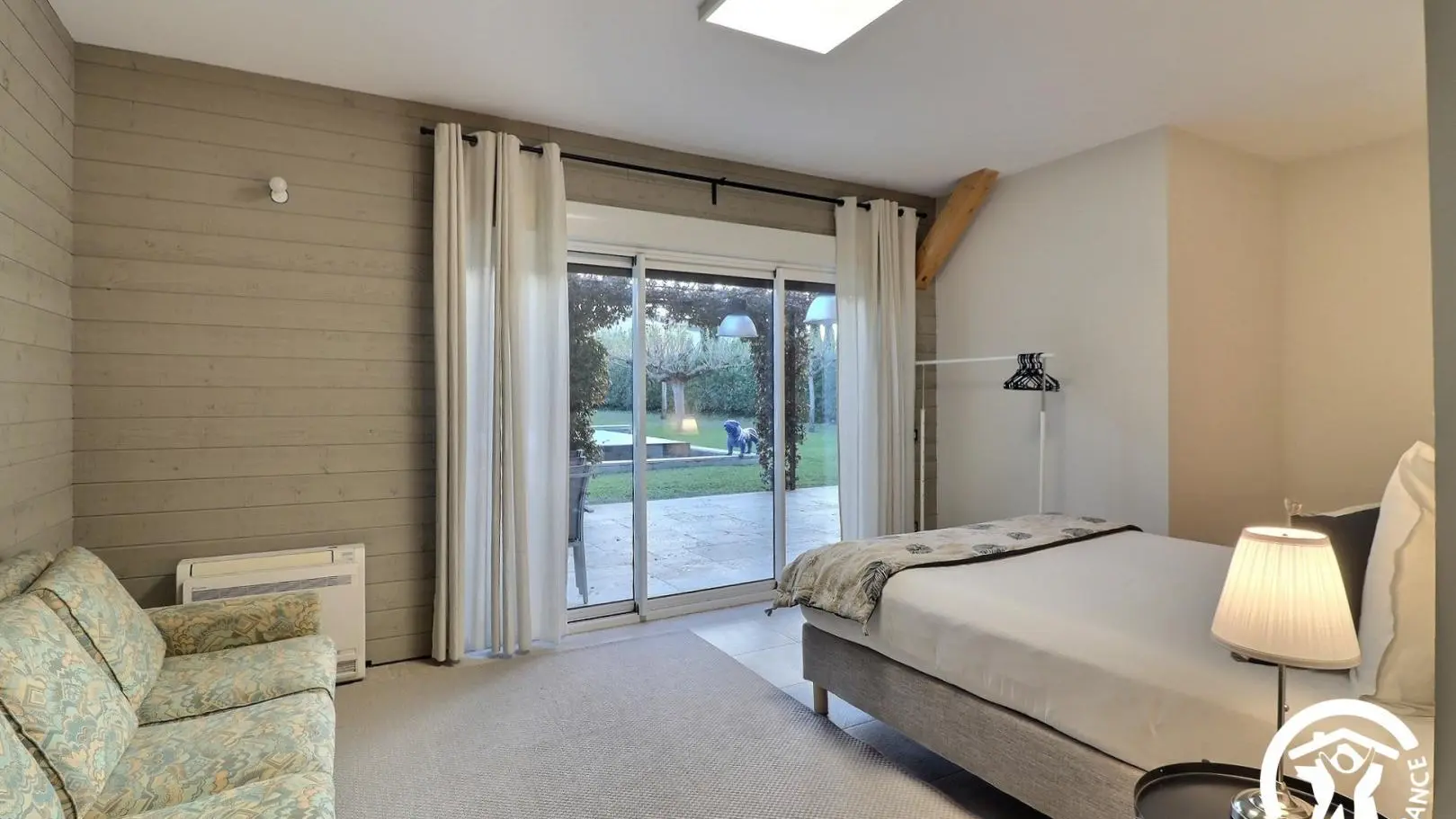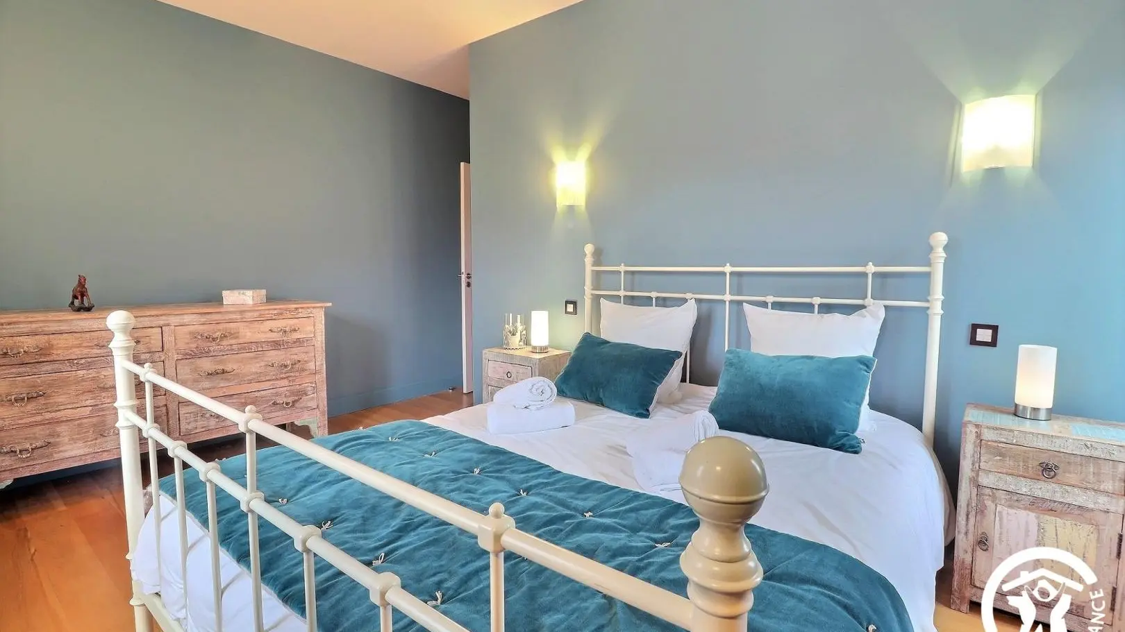 - 1st bedroom with 1 bed 160x200cm, clothes rack and chest of drawers. Bay window overlooking the terrace and the swimming pool, convector fan.