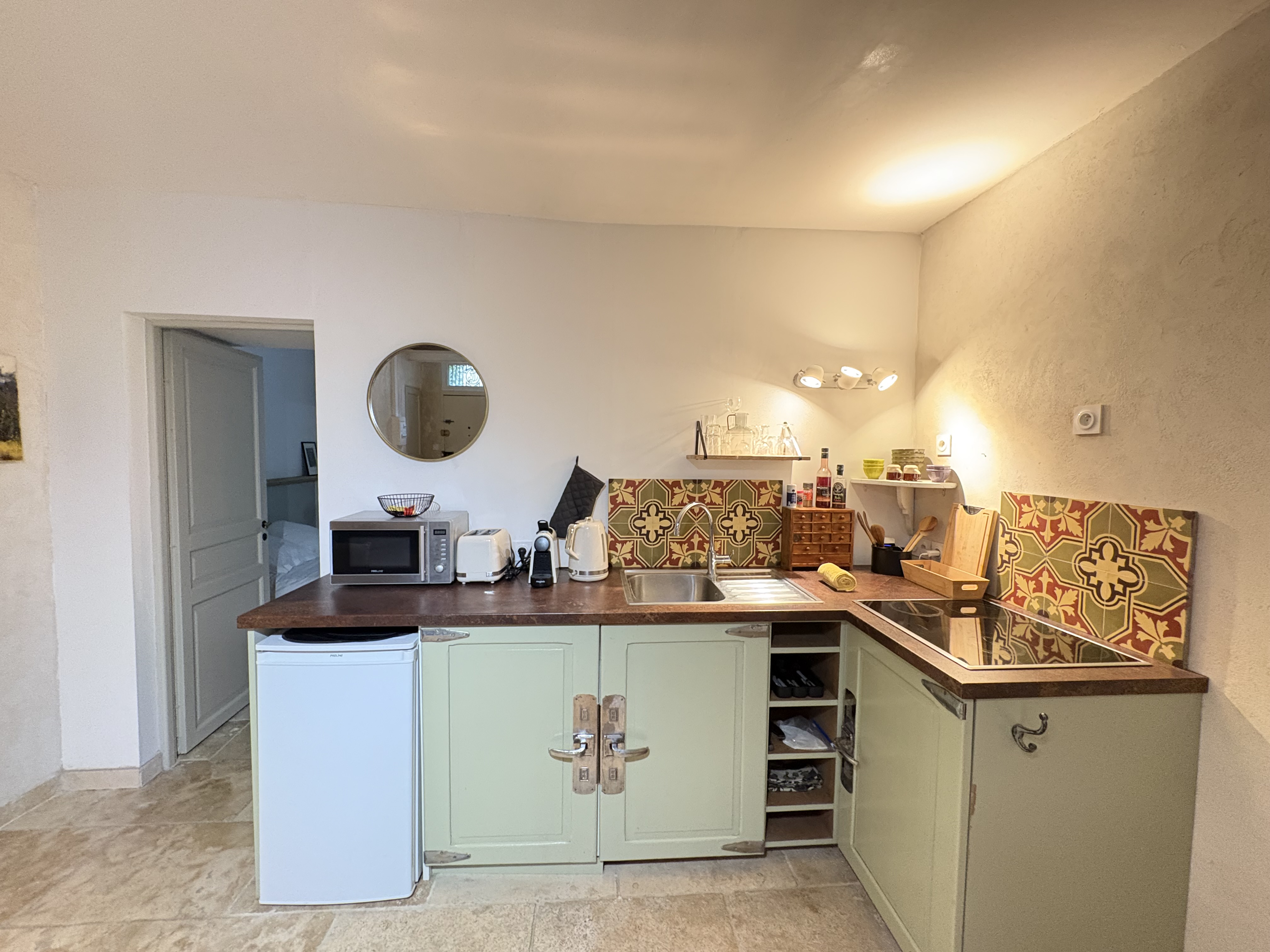 Fridge, hob, microwave, toaster, Nespresso coffee machine, kettle, dishwasher, crockery and kitchen accessories, etc...
