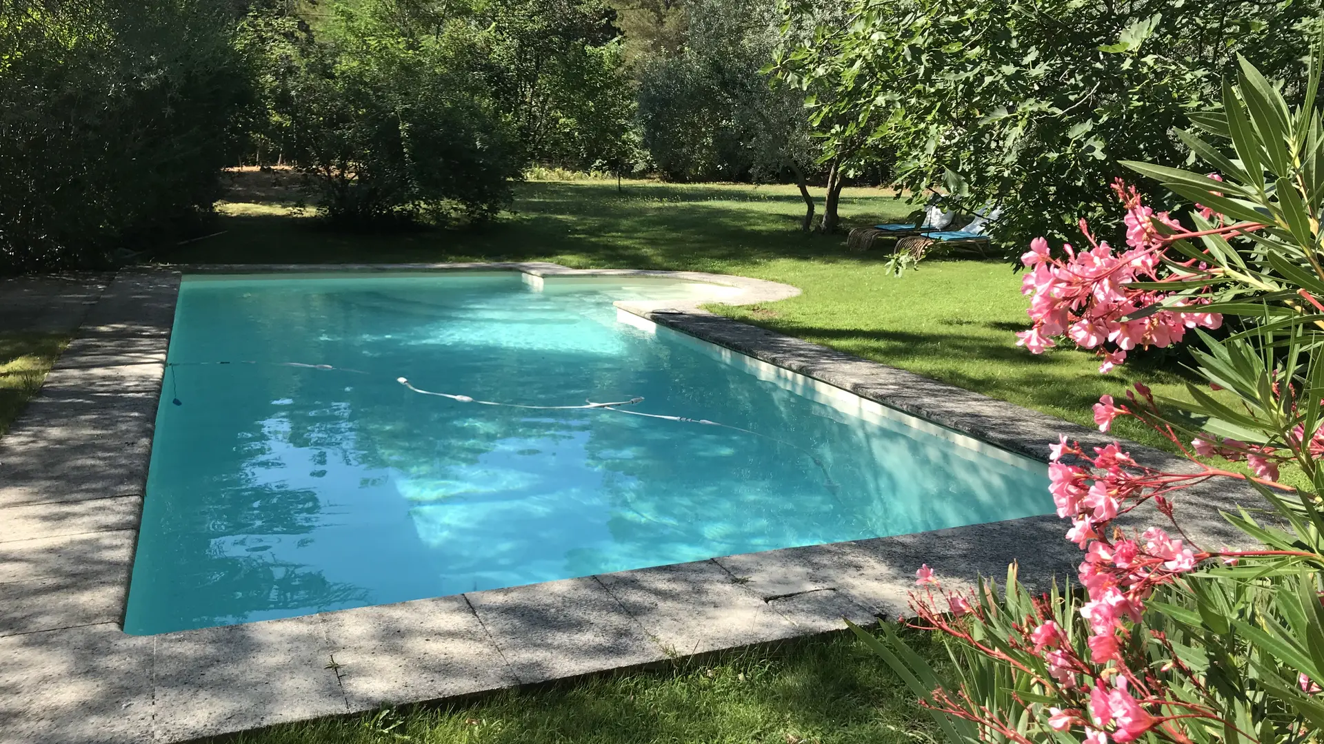 The 1200 m² garden is landscaped with big trees and flowers and is fully fenced.The stone terrace adjoins the 10m x 5m swimming pool.