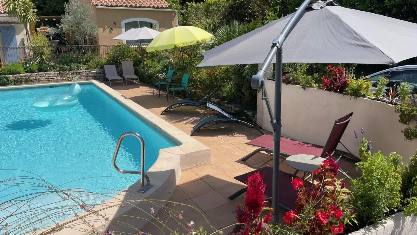 Access to the gite via the terrace of 13.5 m² with its garden furniture, shaded by a remote-controlled electrical store.