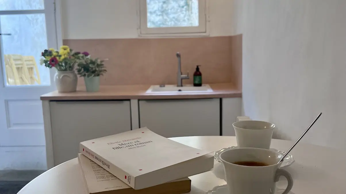 A separate, fully-equipped kitchen opens onto the shady, flower-filled patio, perfect for meals and enjoying the gentle Arlesian lifestyle.