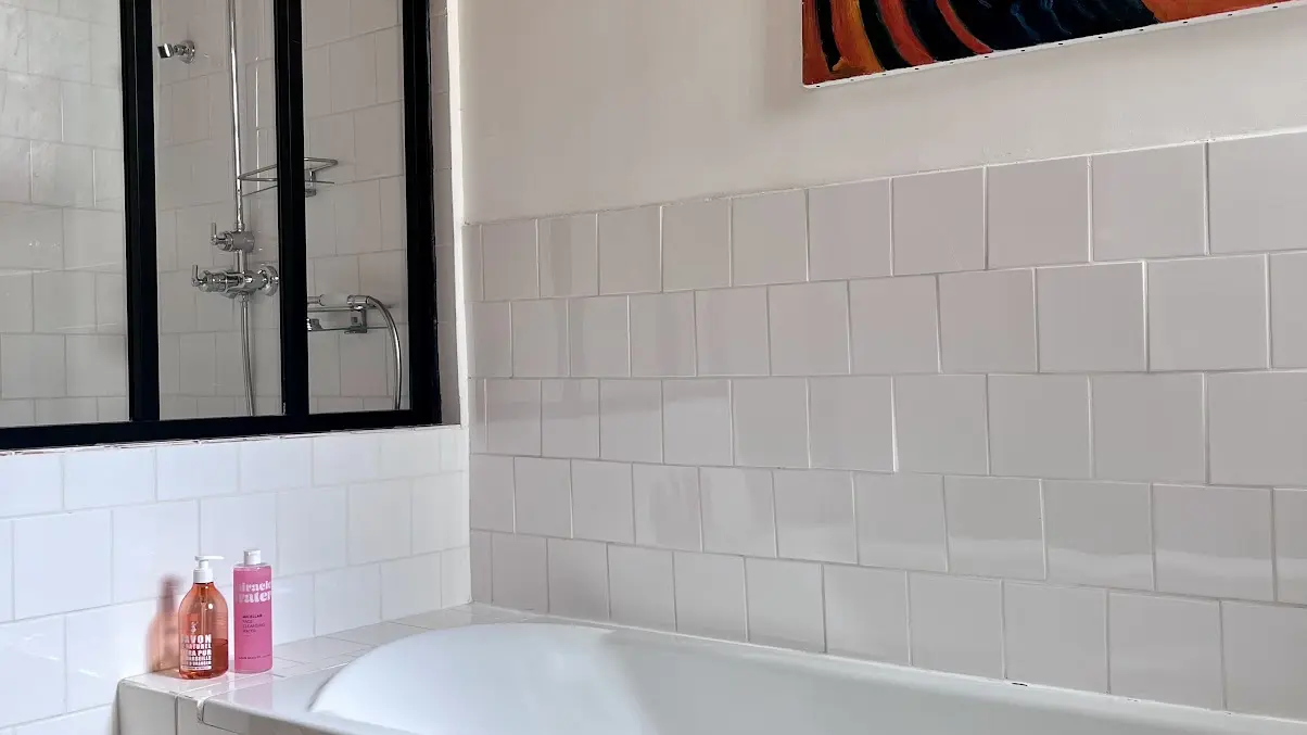 On the second floor, a charming landing leads to two bedrooms, each with a large closet, a bathroom with Italian shower and bathtub, and separate toilet and washbasin.