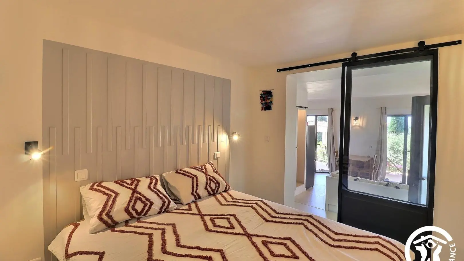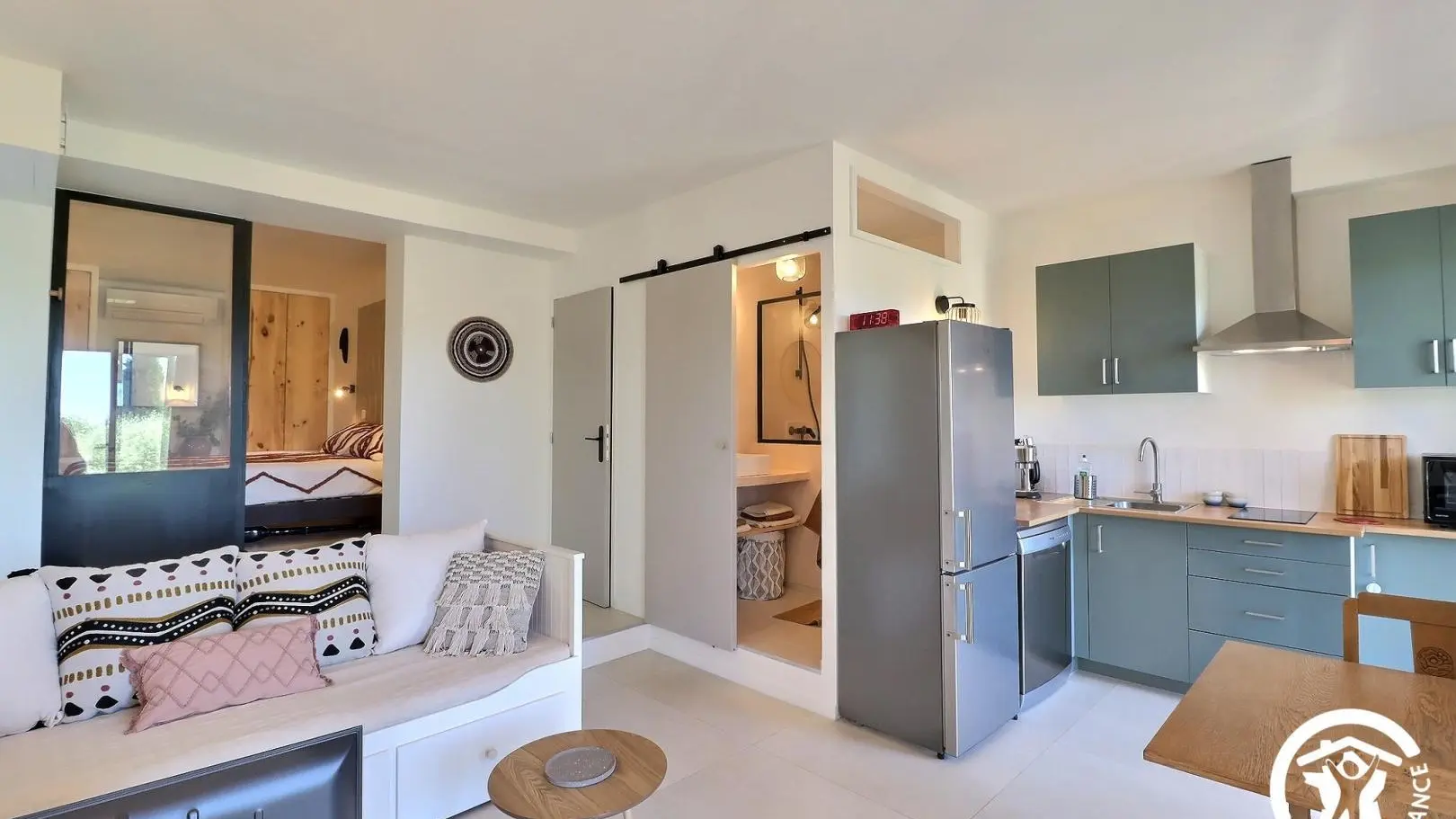 - a living room with sofa (day bed with 2 80x200cm mattresses), connected TV, table, open kitchen with fridge/freezer, dishwasher, combined oven/microwave, coffee percolator, 2 induction hobs. - a sleeping area closed by sliding glass doors: 160x200cm bed, built-in cupboards.