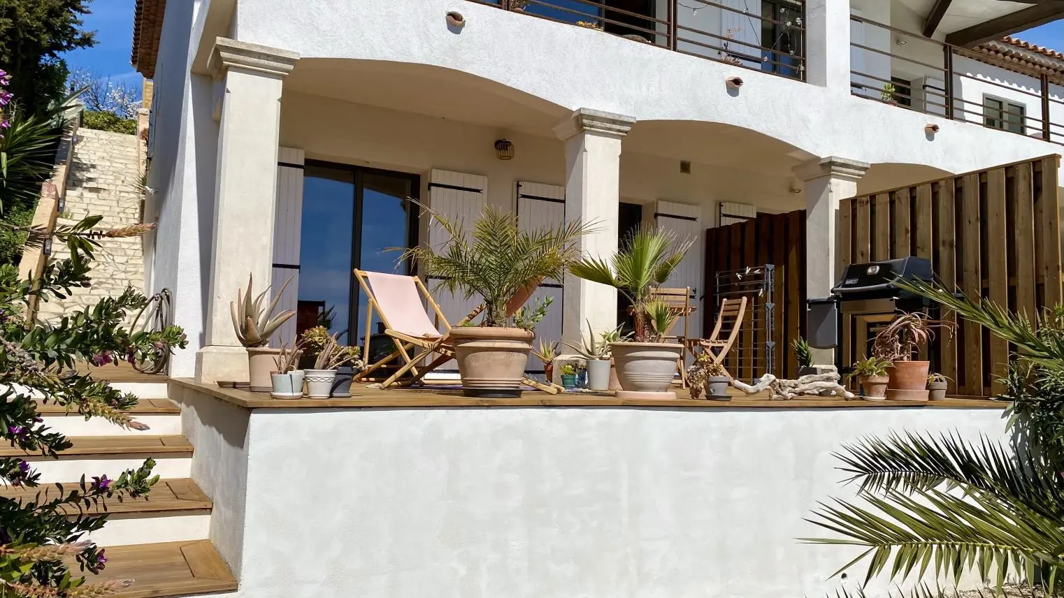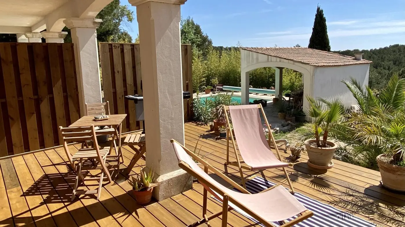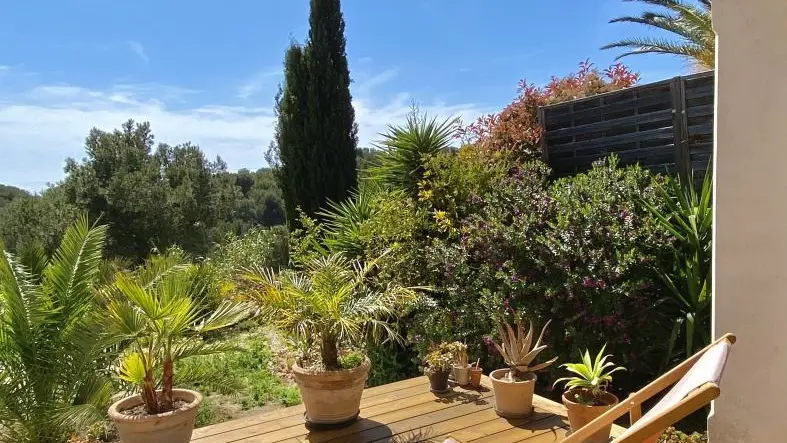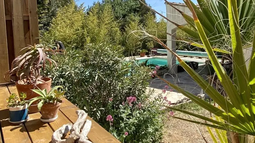 Overlooking the sea on the Côte Bleue, the gîte is a charming apartment located on the ground floor of the owners' house. From the ledge, you will have to go down around forty steps to arrive in your cocoon. The terrace equipped with garden furniture and deckchairs gives access to the swimming pool shared with the owners and offers a beautiful view of the numerous plants and flowers in the garden. The sea is only 2km away, you can hike to the Méjean cove or the sandy beach 6km away. The cottage is composed of: