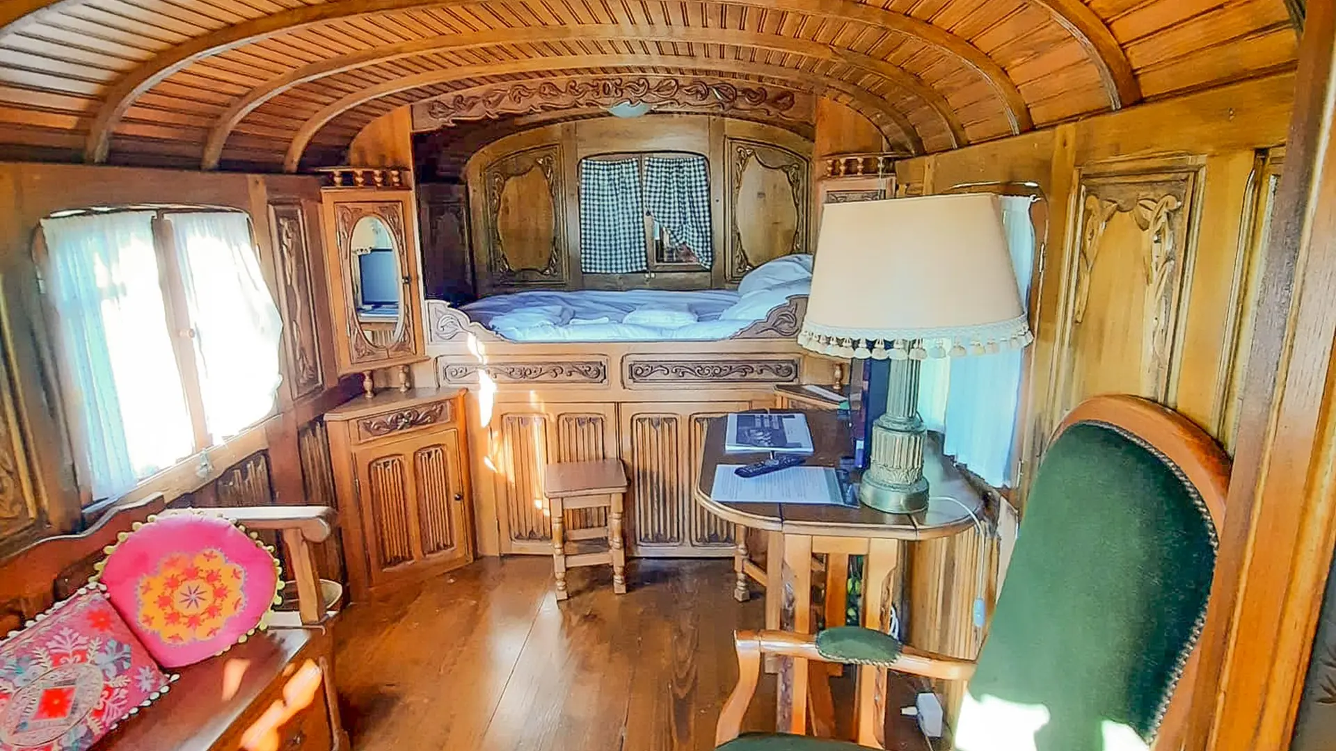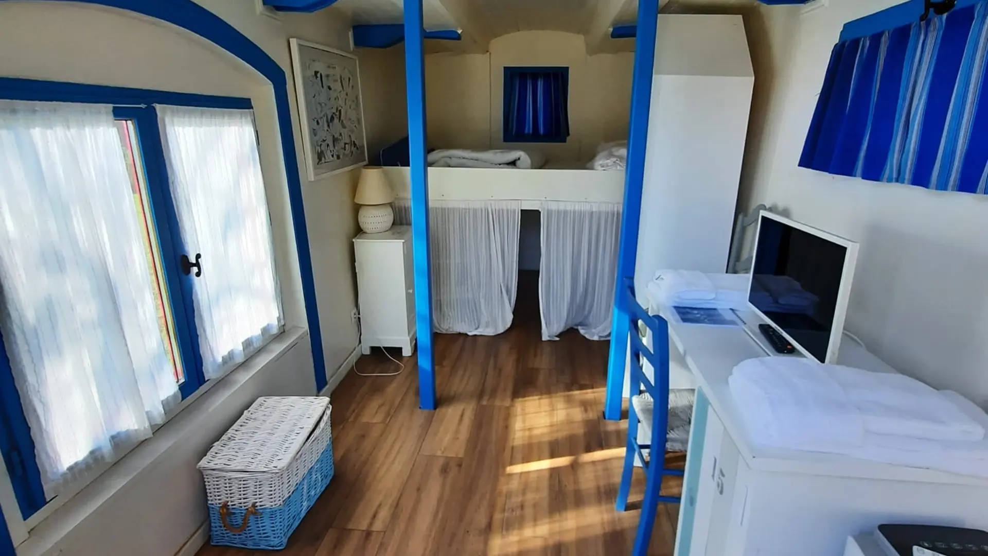 Each caravan is equipped with a double bed, a small TV and small storage spaces and has a private bathroom with toilet in the Old School building. A shared kitchen is also available.