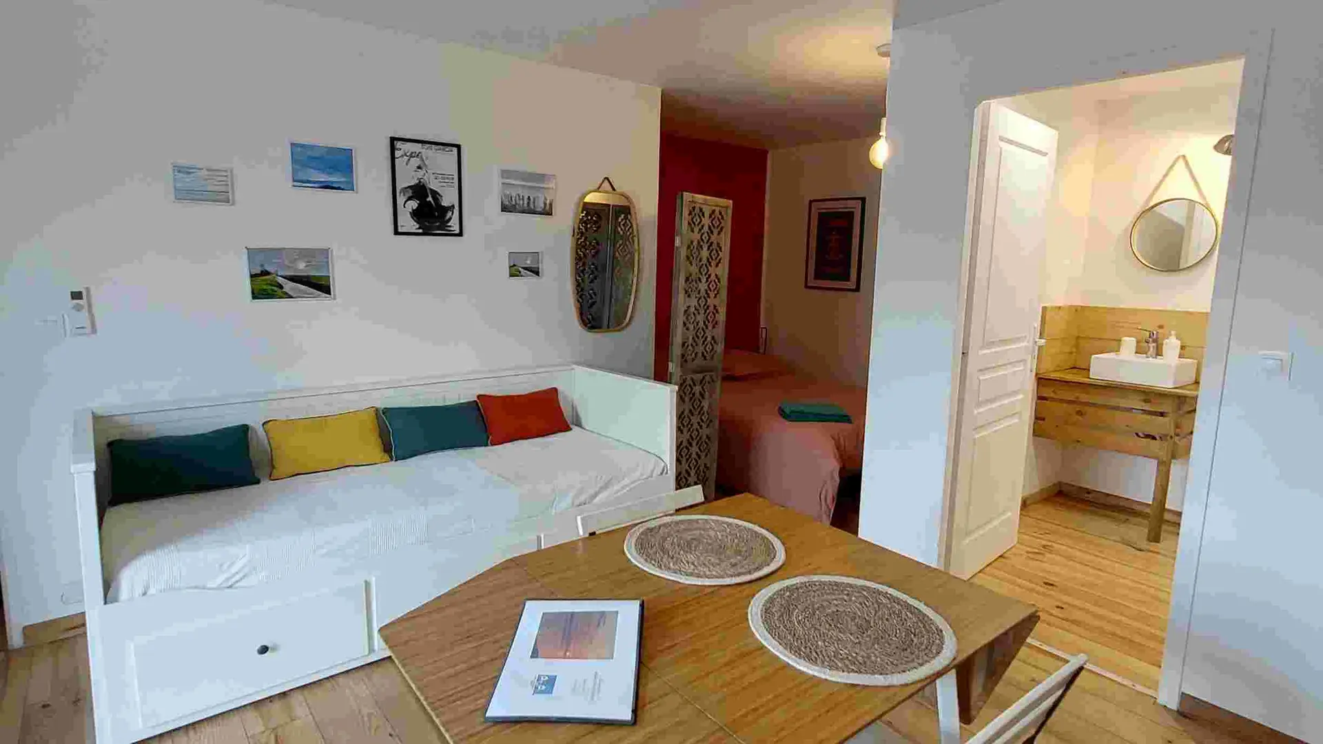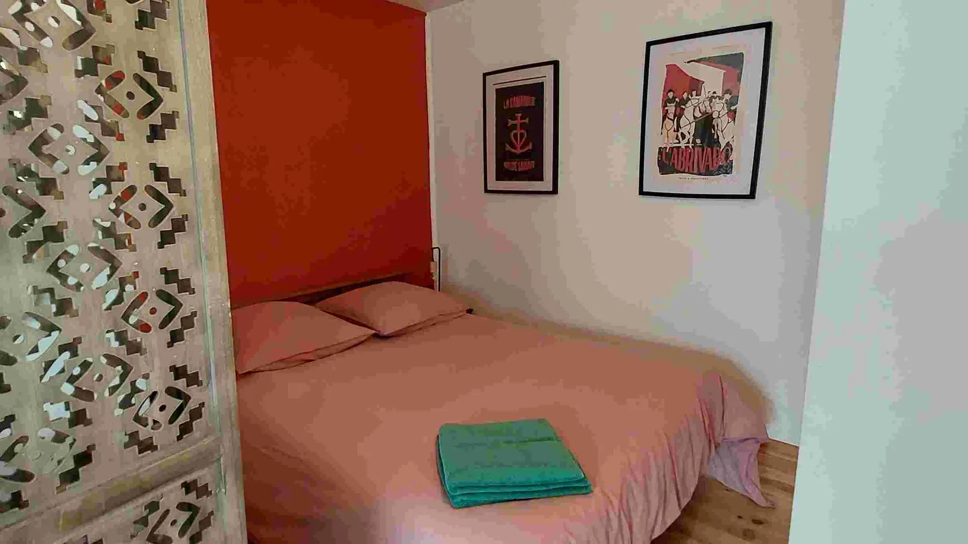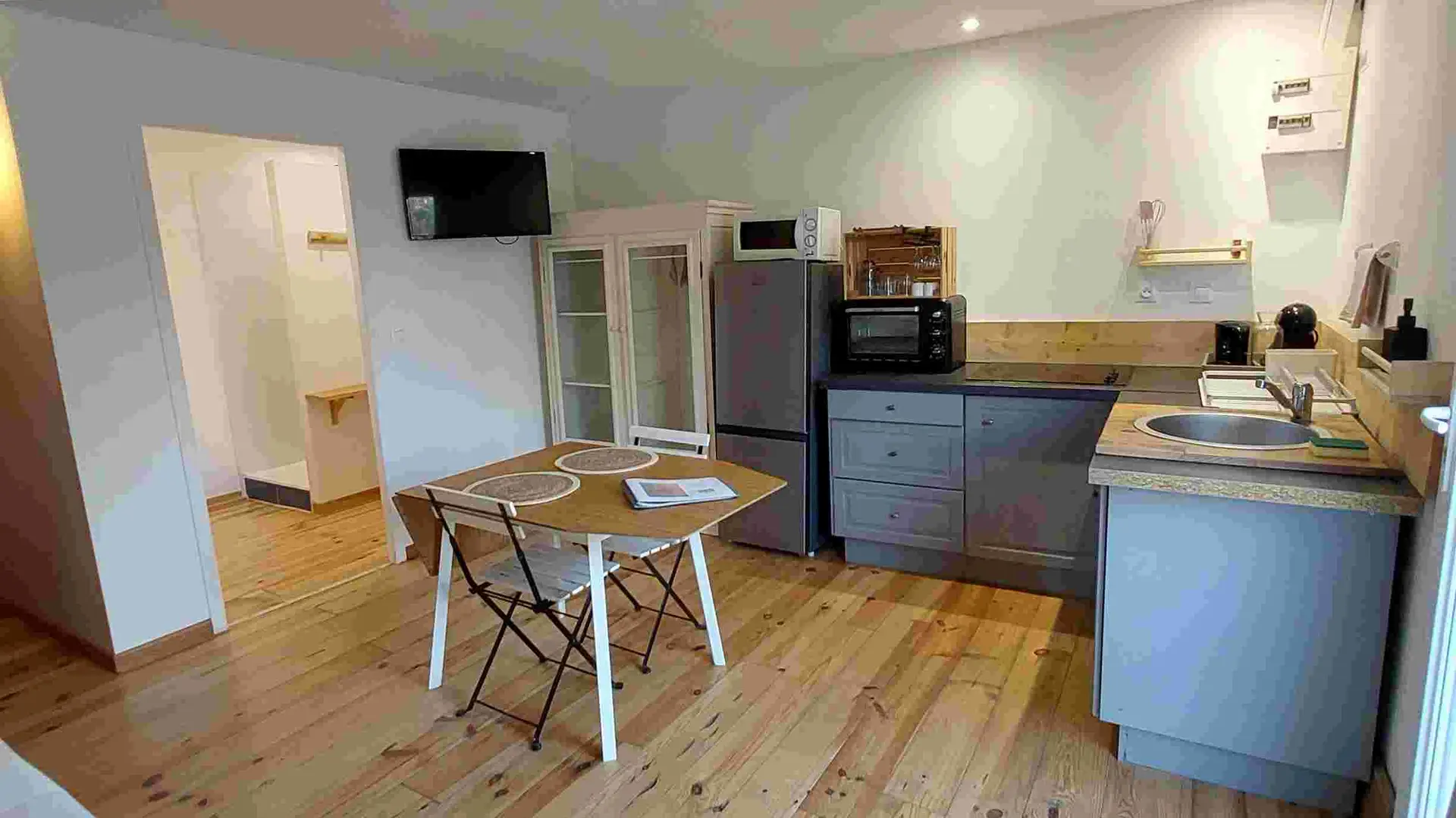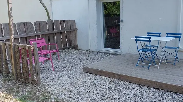On one level, it opens onto a large private terrace with barbecue. It is laid out like a large studio with a sleeping area, a large bathroom and a living room/kitchen area.