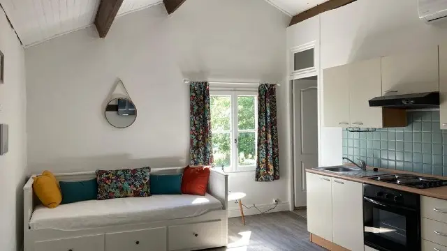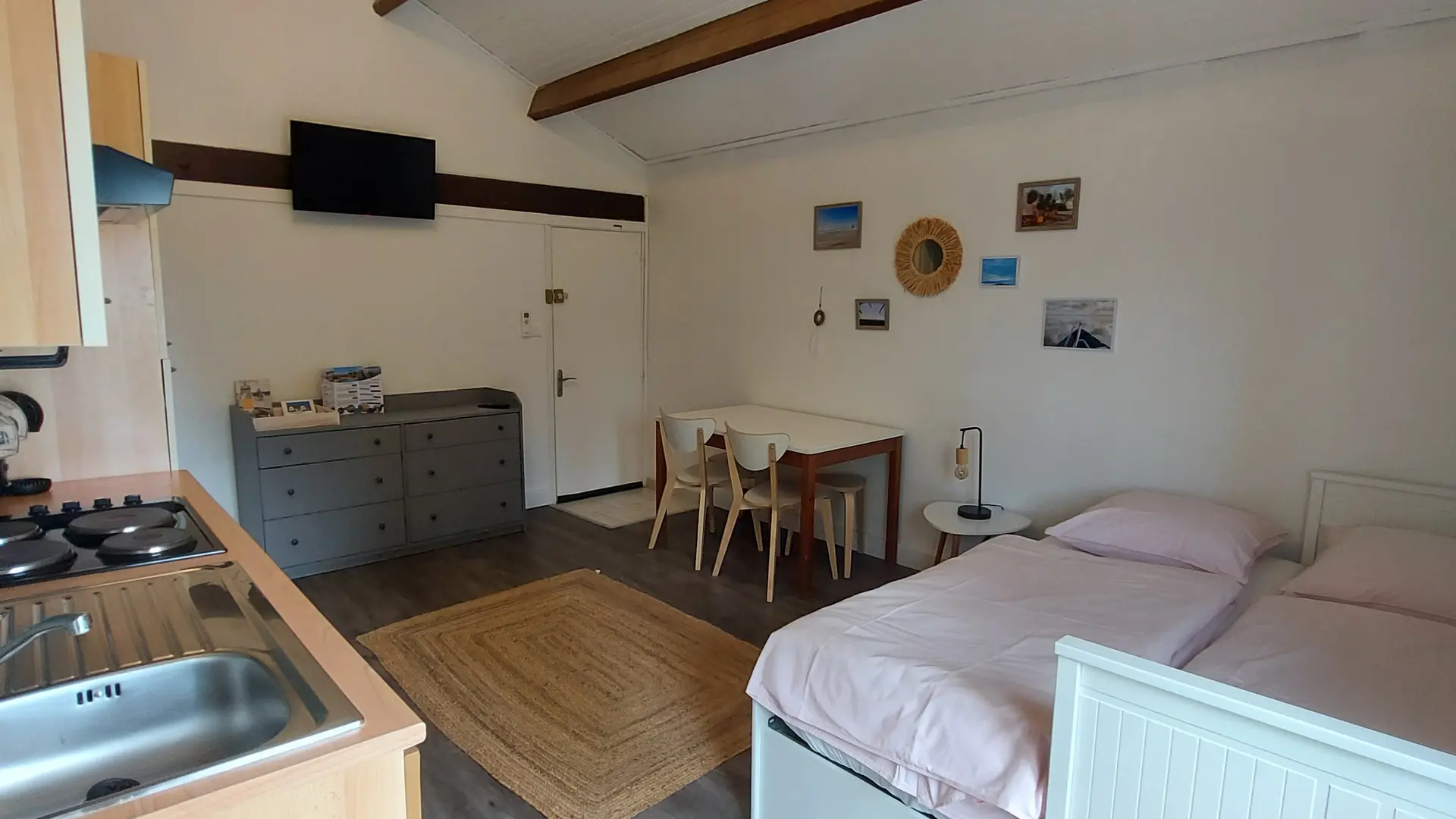 The main room is spacious, with a fully equipped kitchen, sofa bed, table and 4 chairs. Next door, a bedroom with a 140 cm bed.