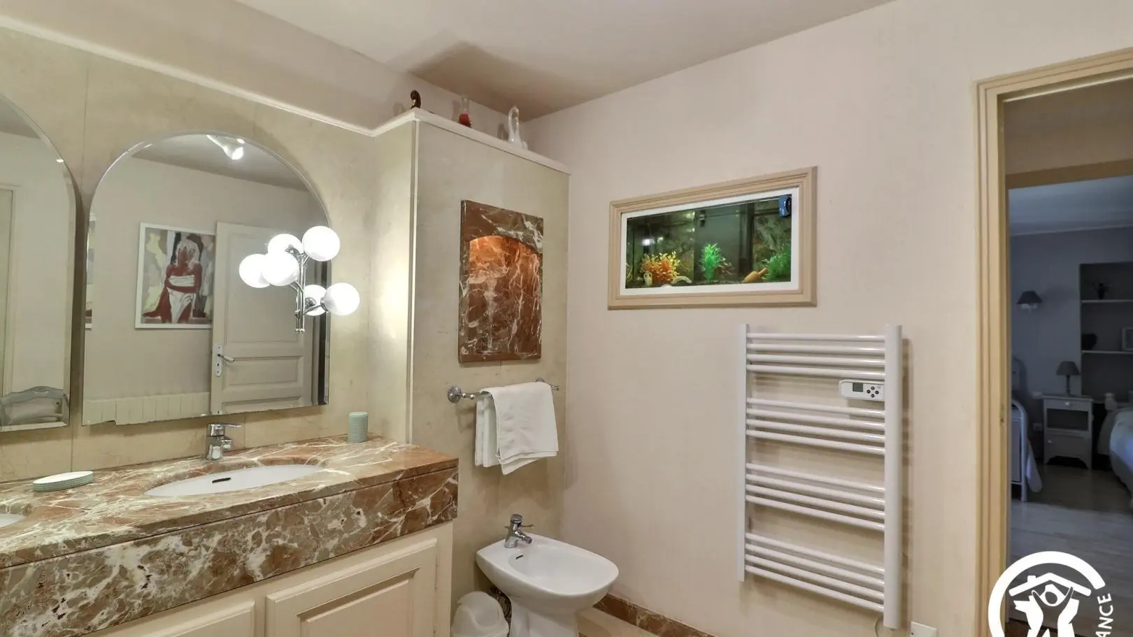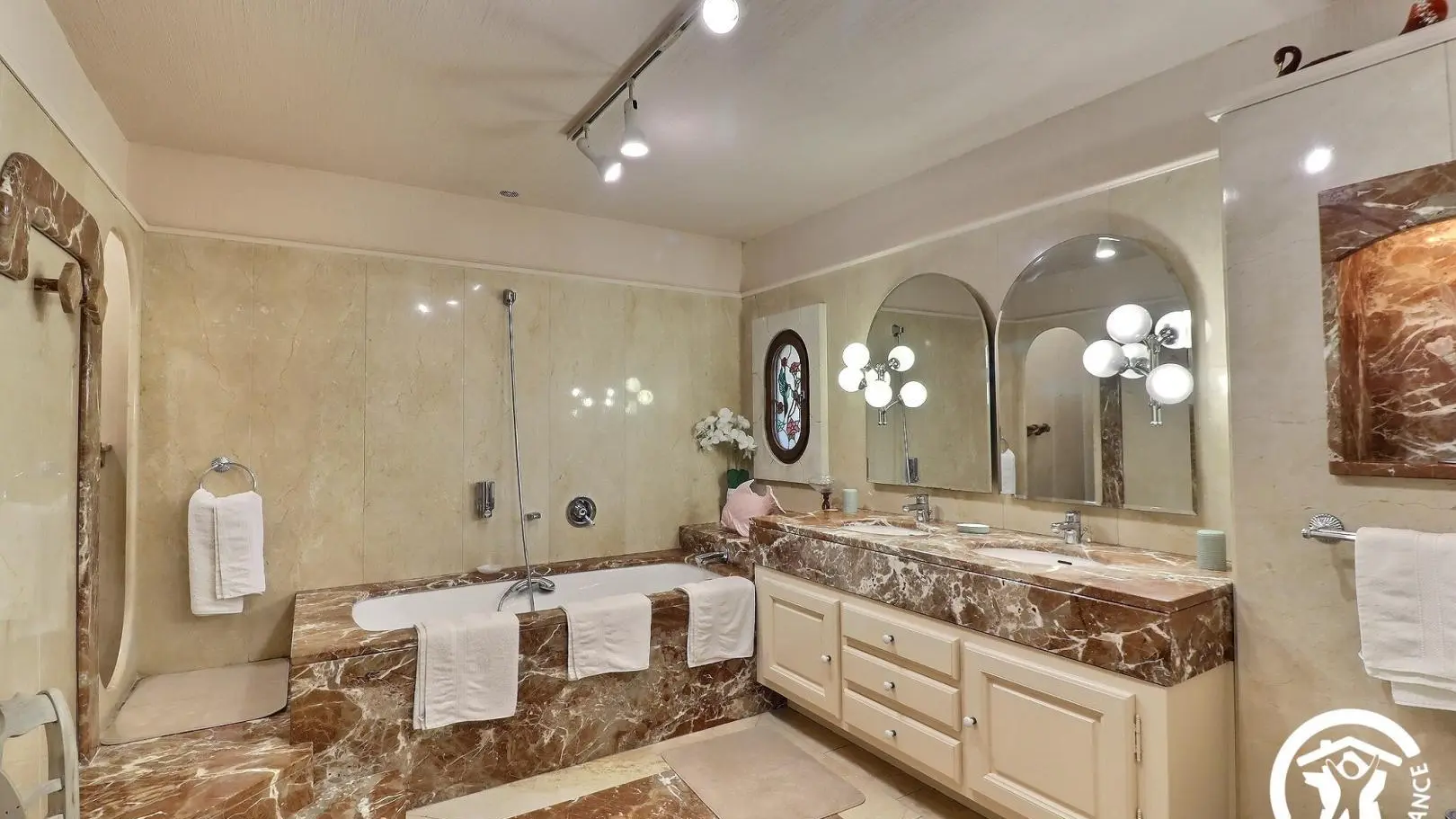 - A bathroom with a Bathtub, shower, double sink vanity, and heated towel rail