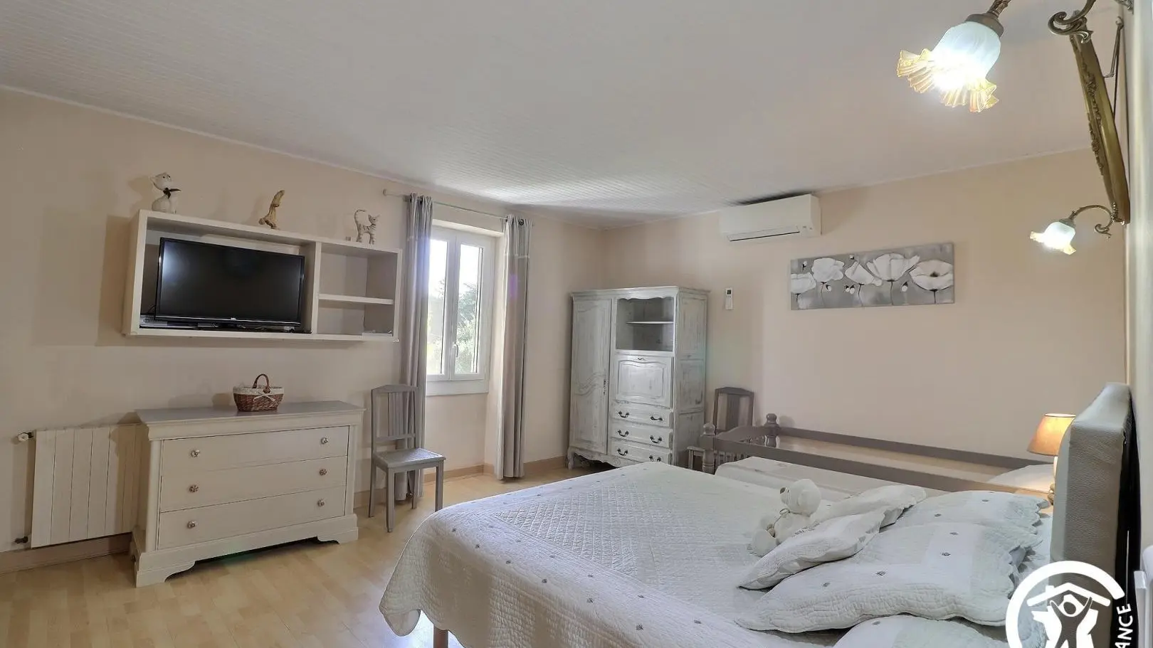 - A second air-conditioned bedroom with a 140x200 cm bed and a 90x190 cm bed (recommended for a child), a wardrobe, and a TV.