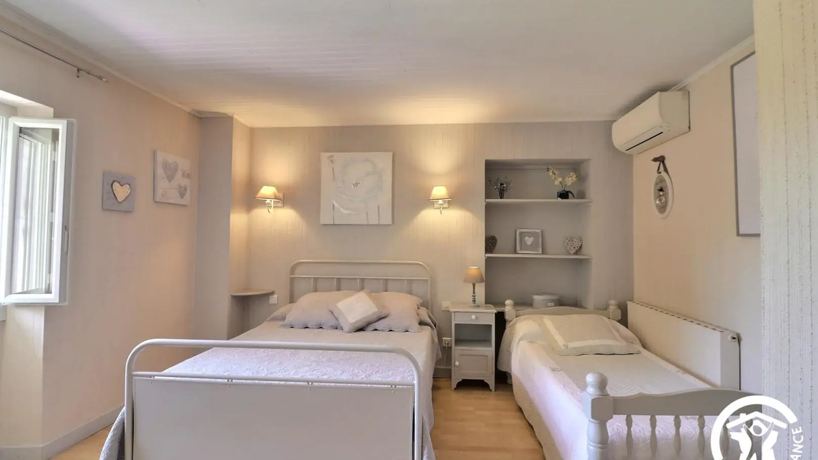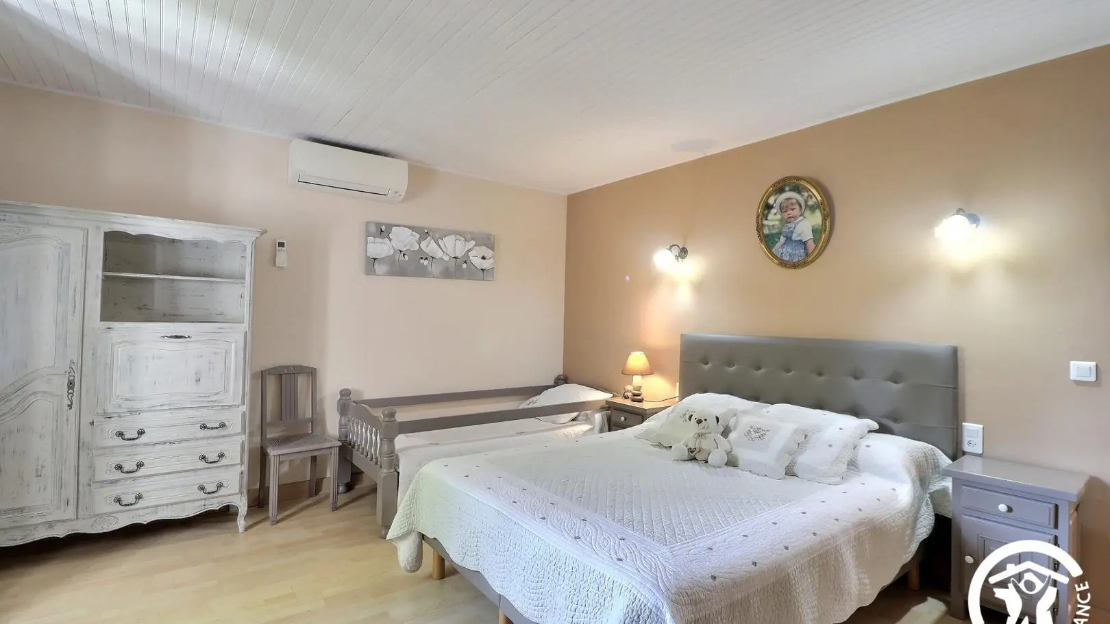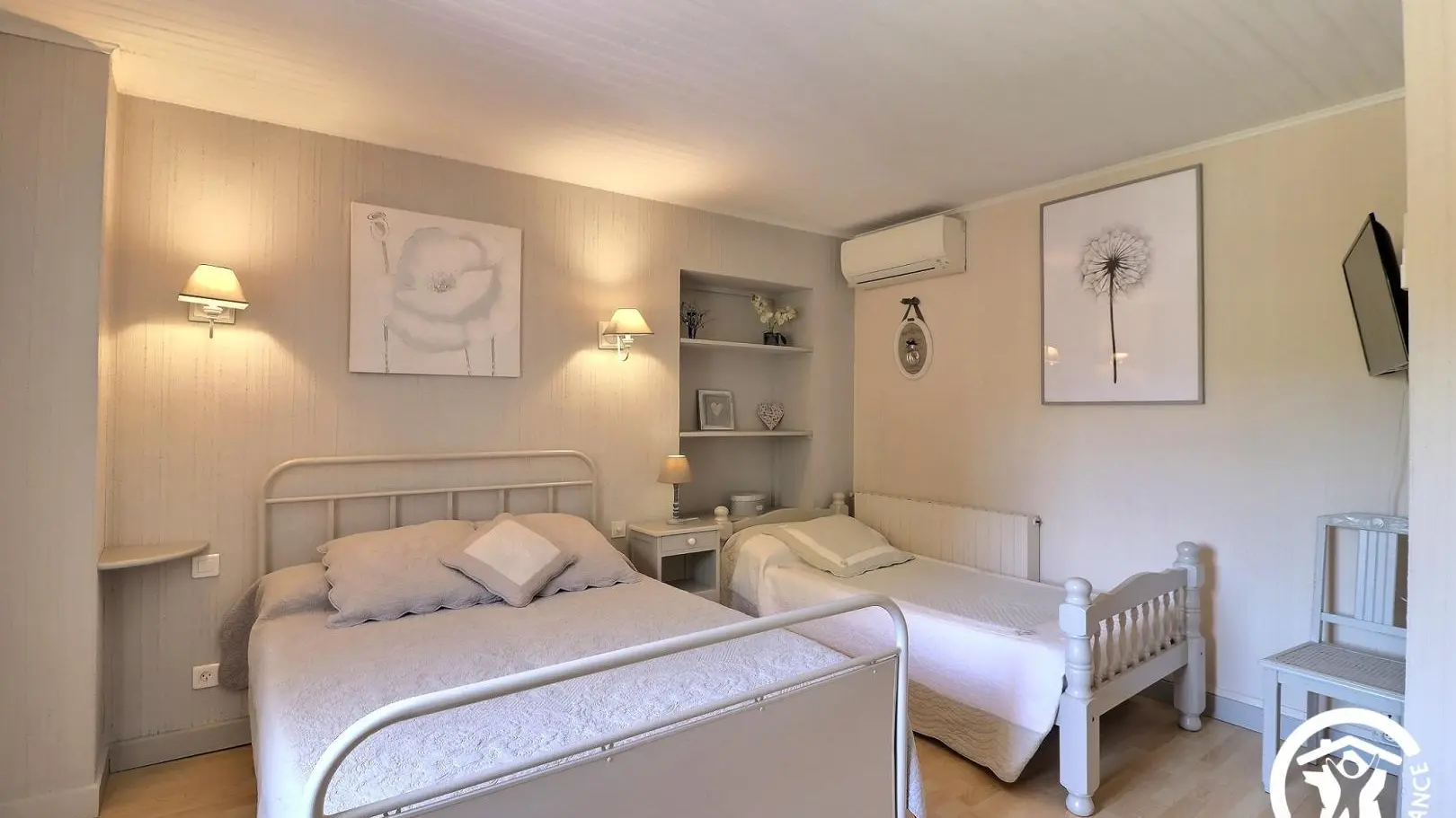 - A first air-conditioned bedroom with a 160x200 cm bed and a 90x190 cm bed (recommended for a child), a wardrobe, and a TV.