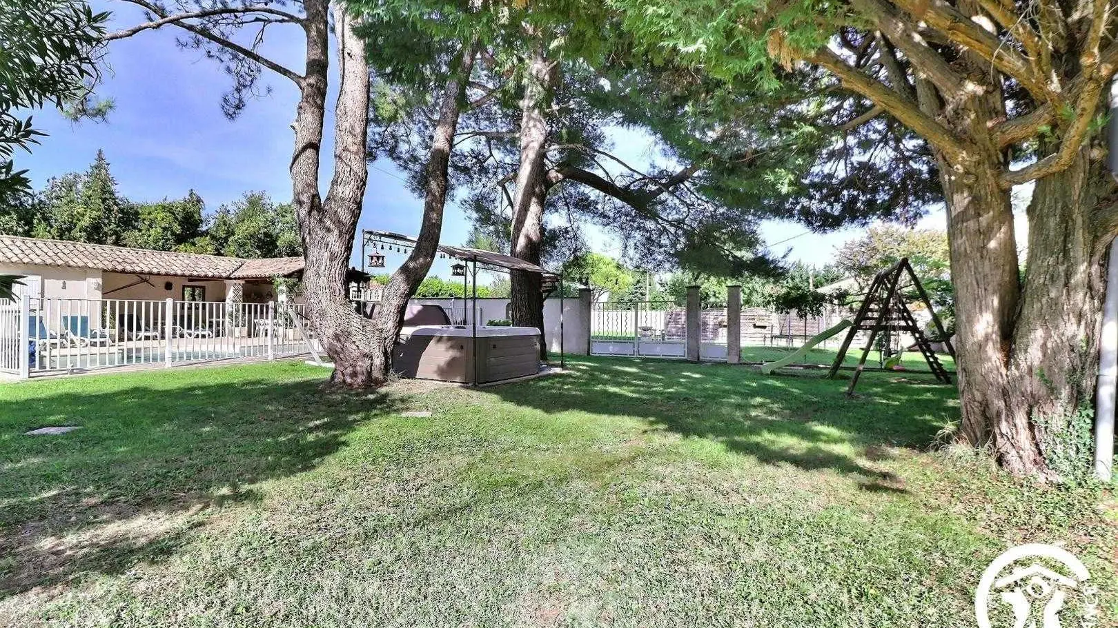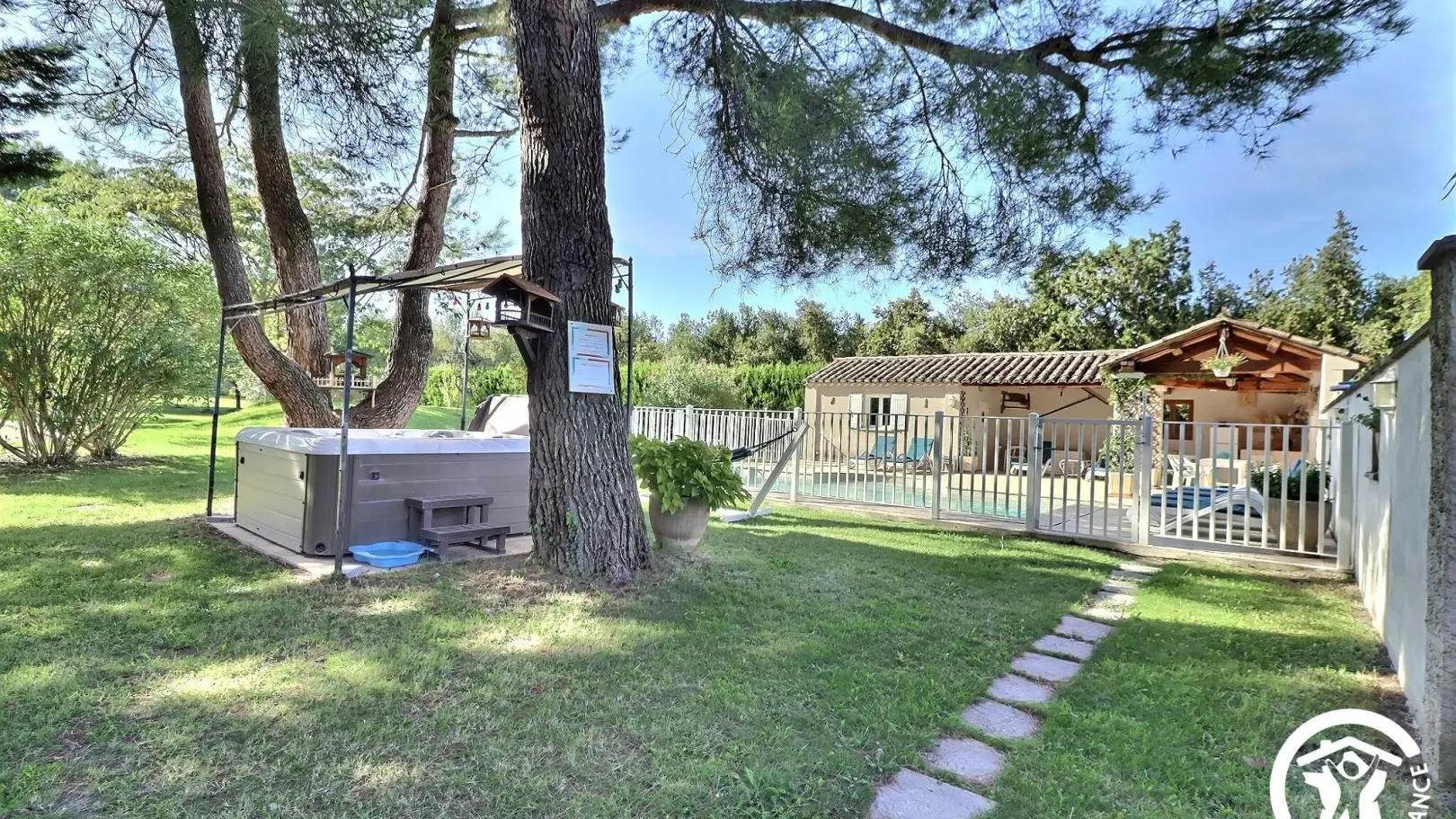 Set on a 4,000 m² wooded plot, the farmhouse offers a large, fully enclosed garden, perfect for letting children play in complete safety. You can enjoy a beautiful shaded terrace for outdoor dining, a jacuzzi for relaxing moments, and a private swimming pool (8m x 4m, 1.50 to 1.60m deep, chlorine-treated and secured by a gate).