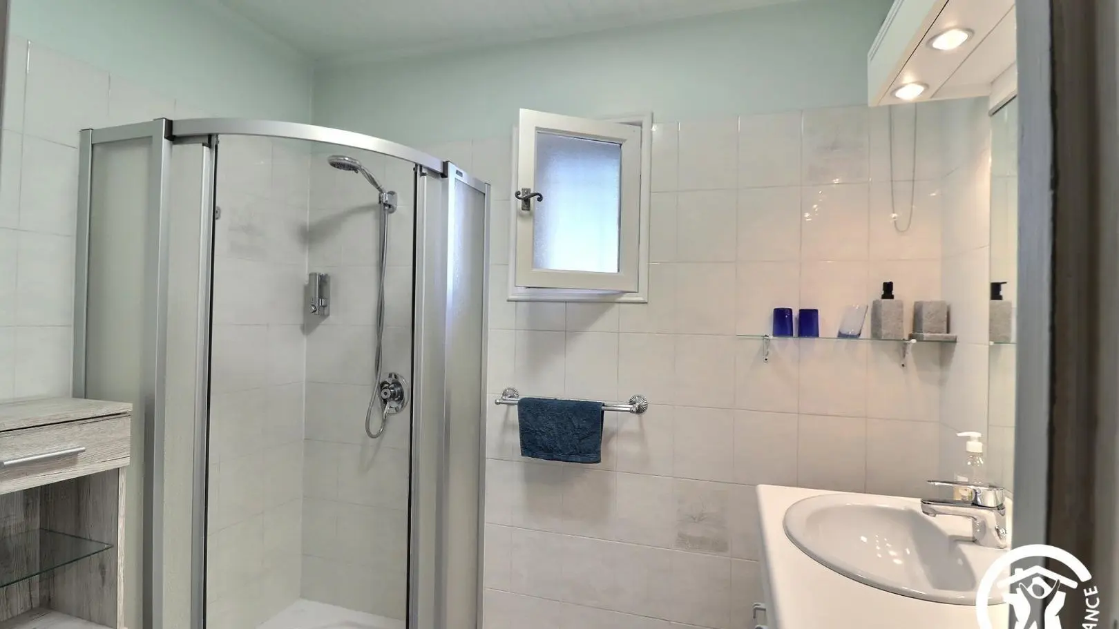 - A bathroom with a shower and a vanity unit.