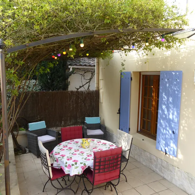 Furnished, 65 m2 Large private terrace, shaded: vine, rose climbing lounge / dining room / kitchen with windows opening on terrace. The fully equipped kitchen. 1 bedroom king-size bed, 1 with 2 single beds. l. Large garden, pool to share with other furnished.