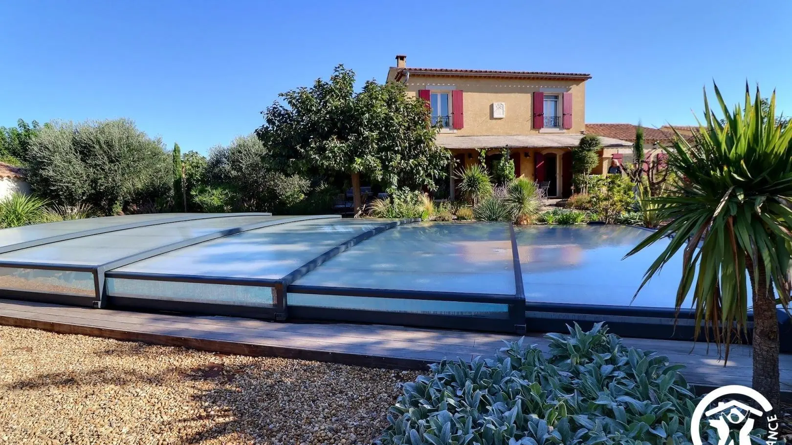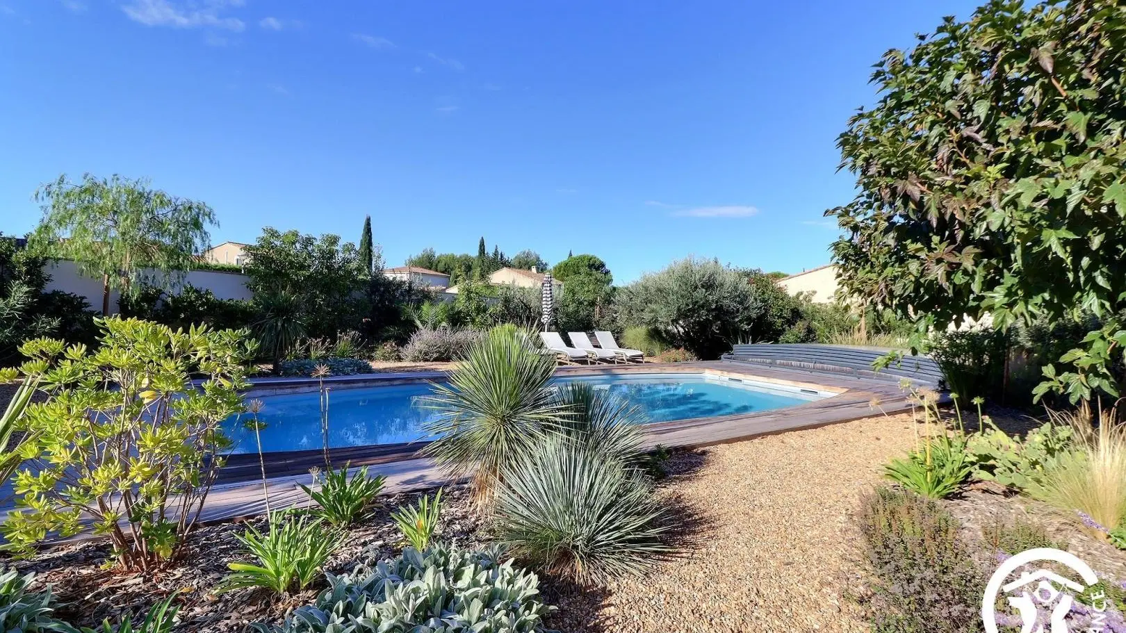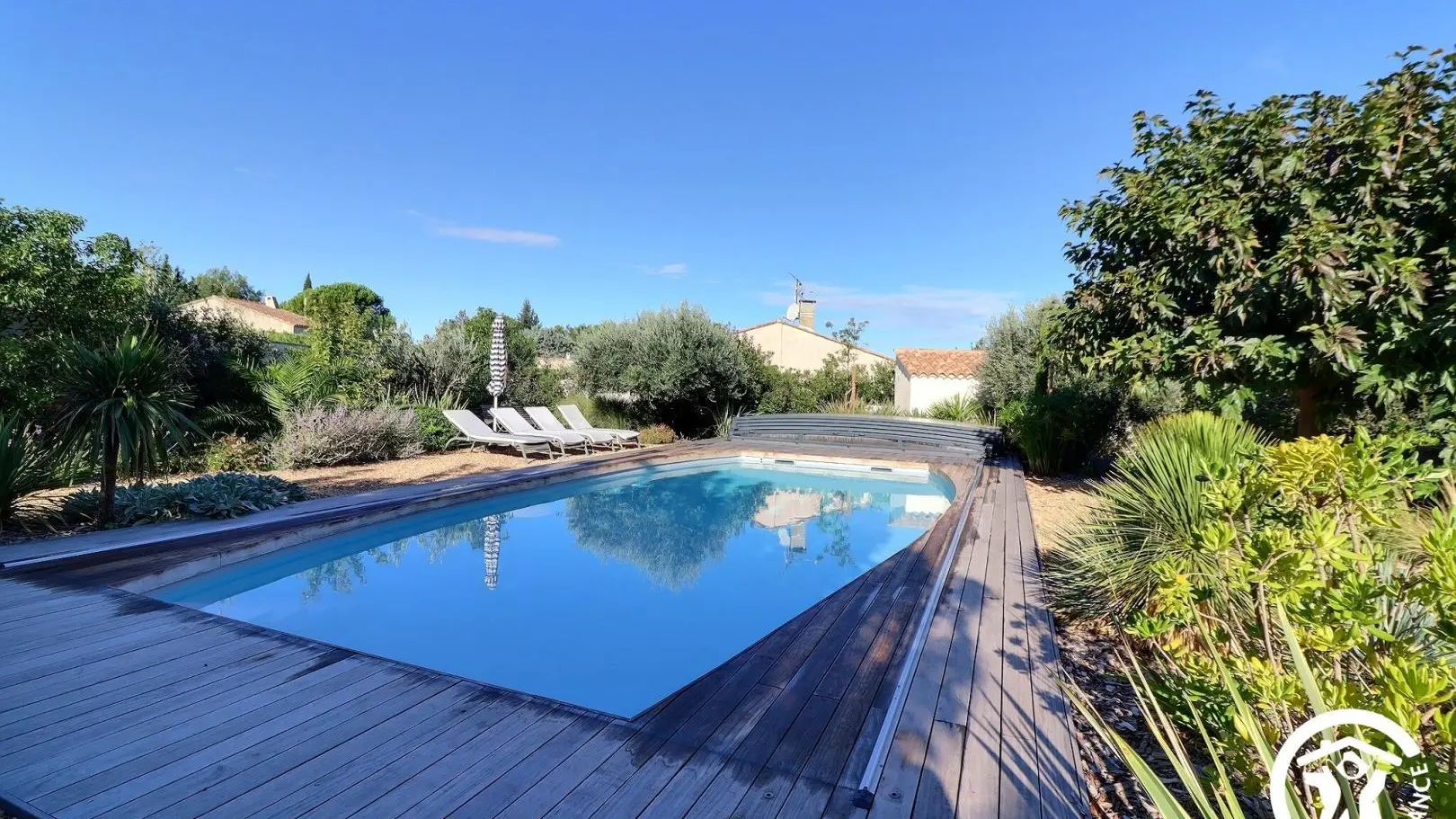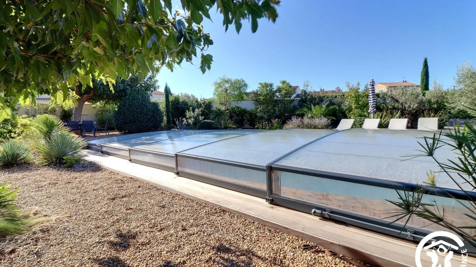 It features a 1000m² landscaped garden with two terraces, one facing south and one facing west, and a 10x4.5m swimming pool with a telescopic cover for heating the pool (open from May to September, weather permitting).