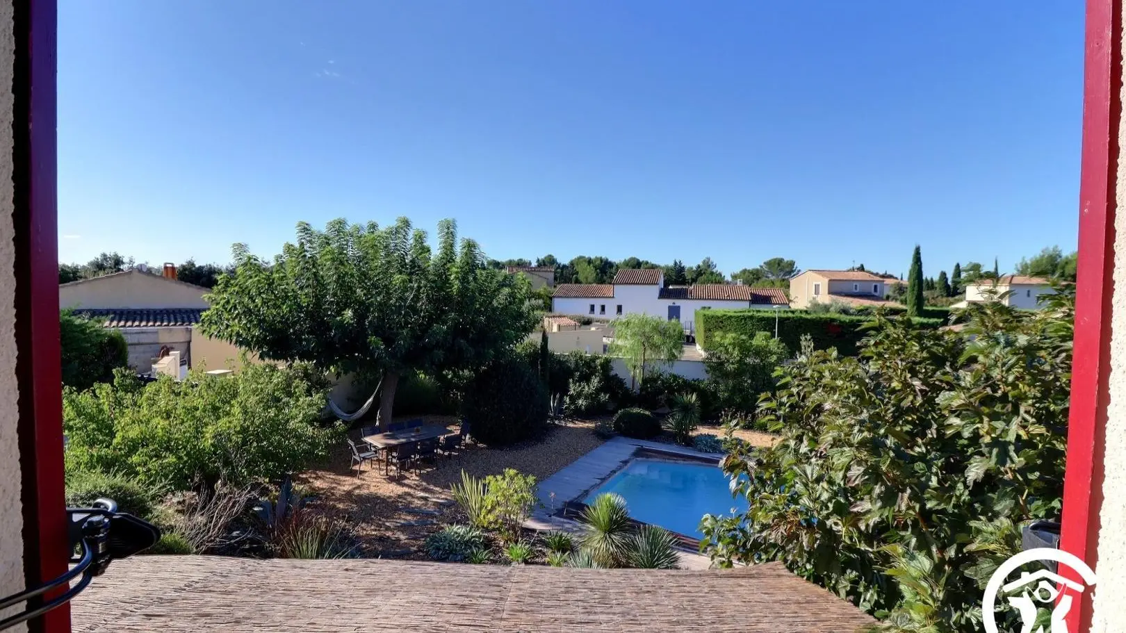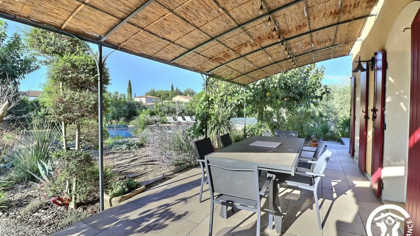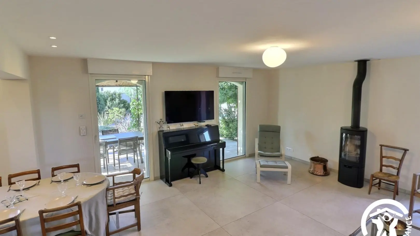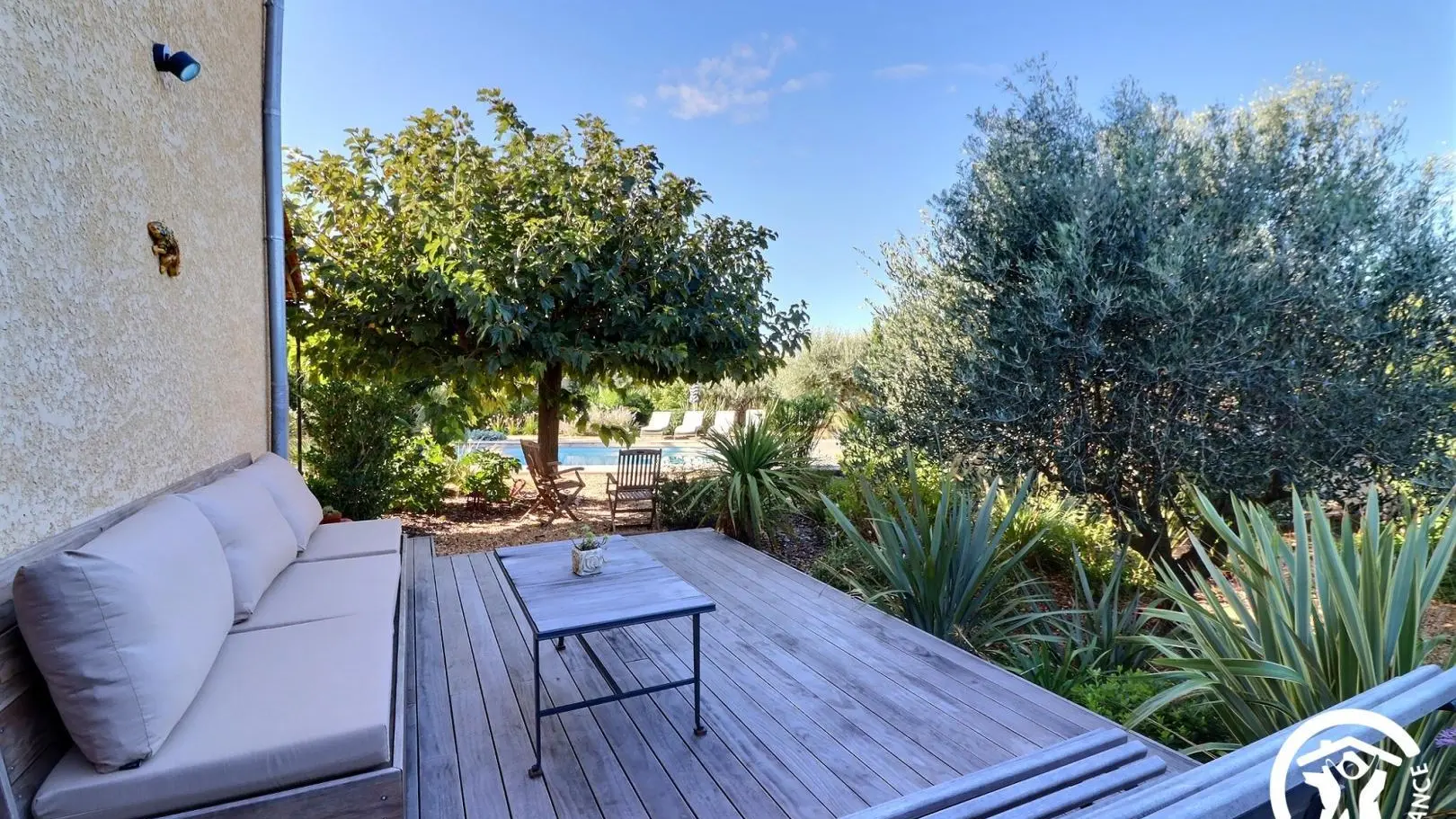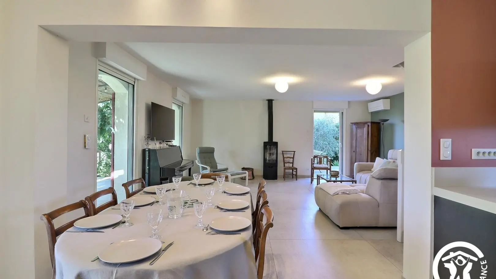 It features a 1000m² landscaped garden with two terraces, one facing south and one facing west, and a 10x4.5m swimming pool with a telescopic cover for heating the pool (open from May to September, weather permitting).
