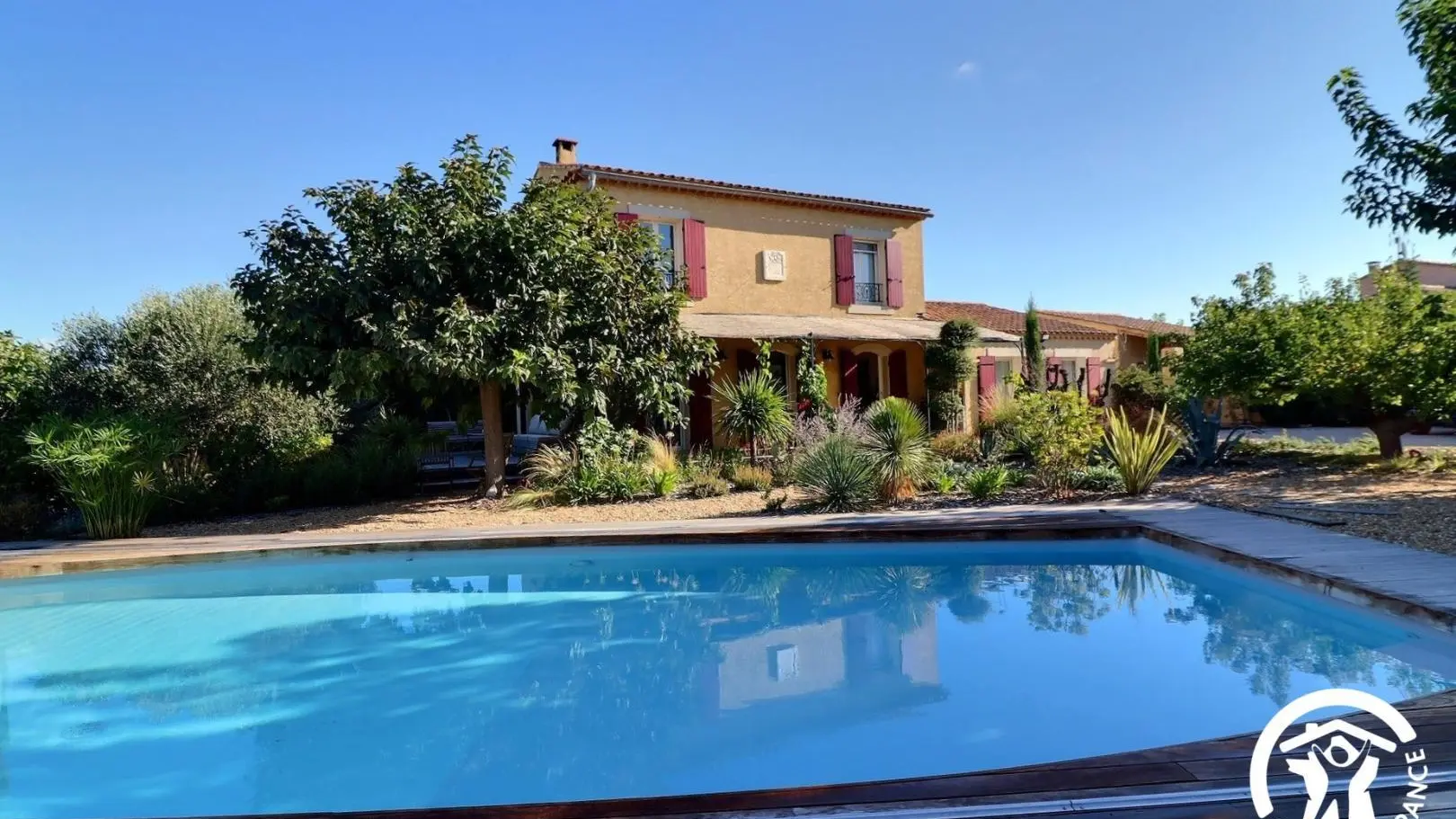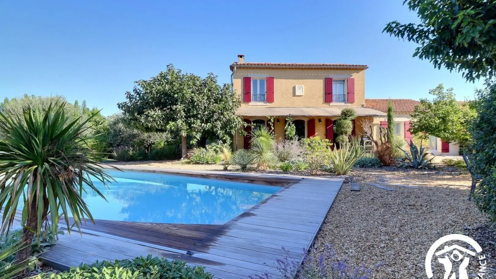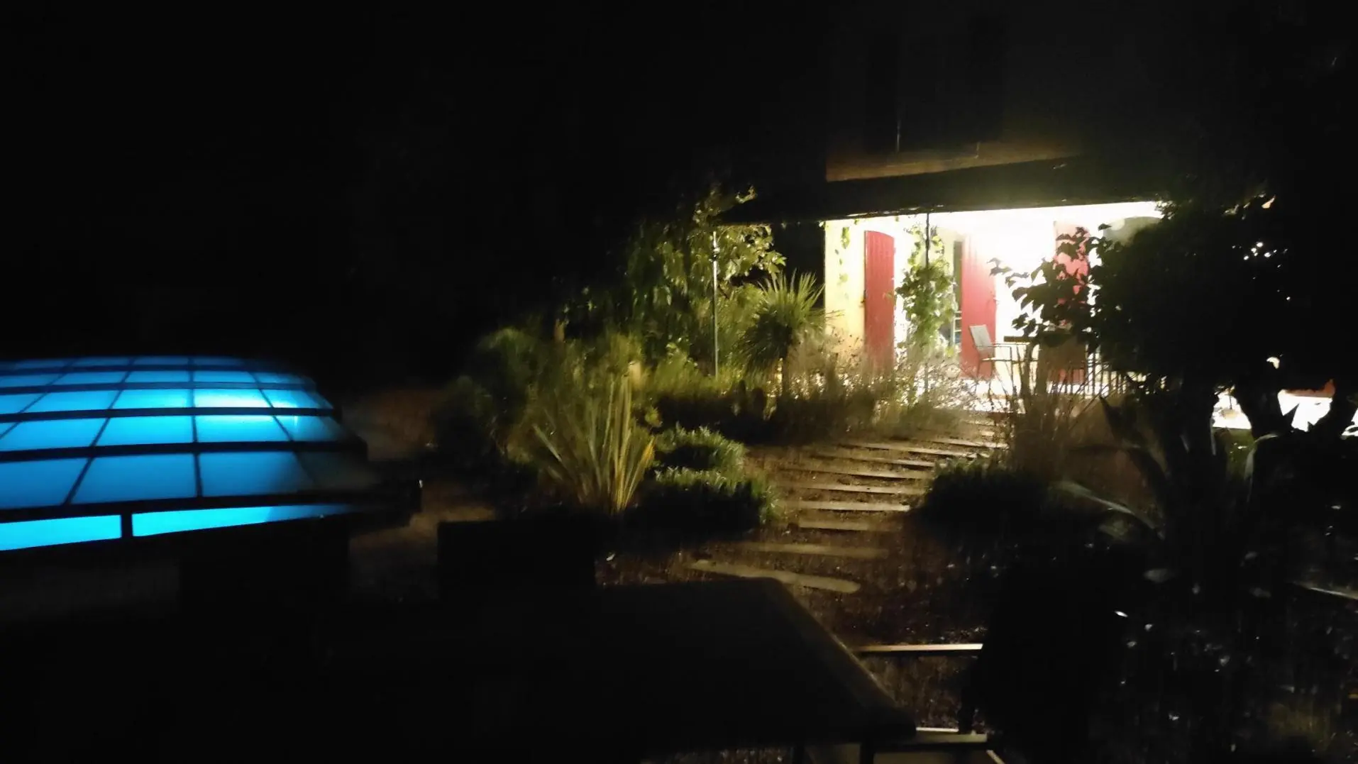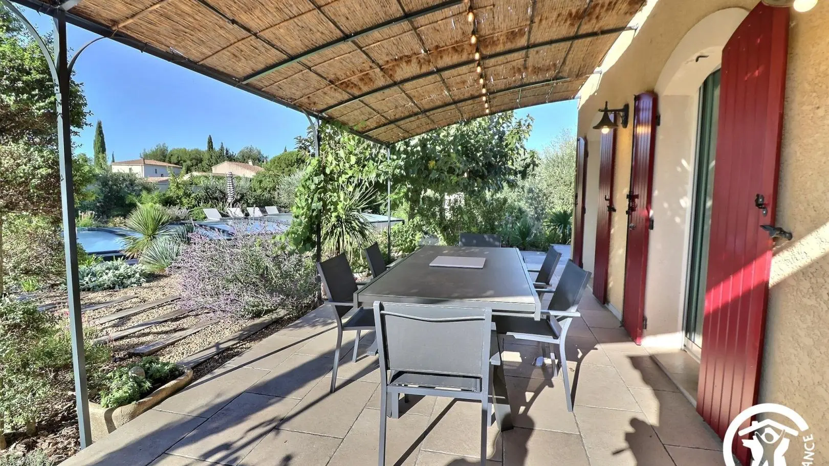 It features a 1000m² landscaped garden with two terraces, one facing south and one facing west, and a 10x4.5m swimming pool with a telescopic cover for heating the pool (open from May to September, weather permitting).