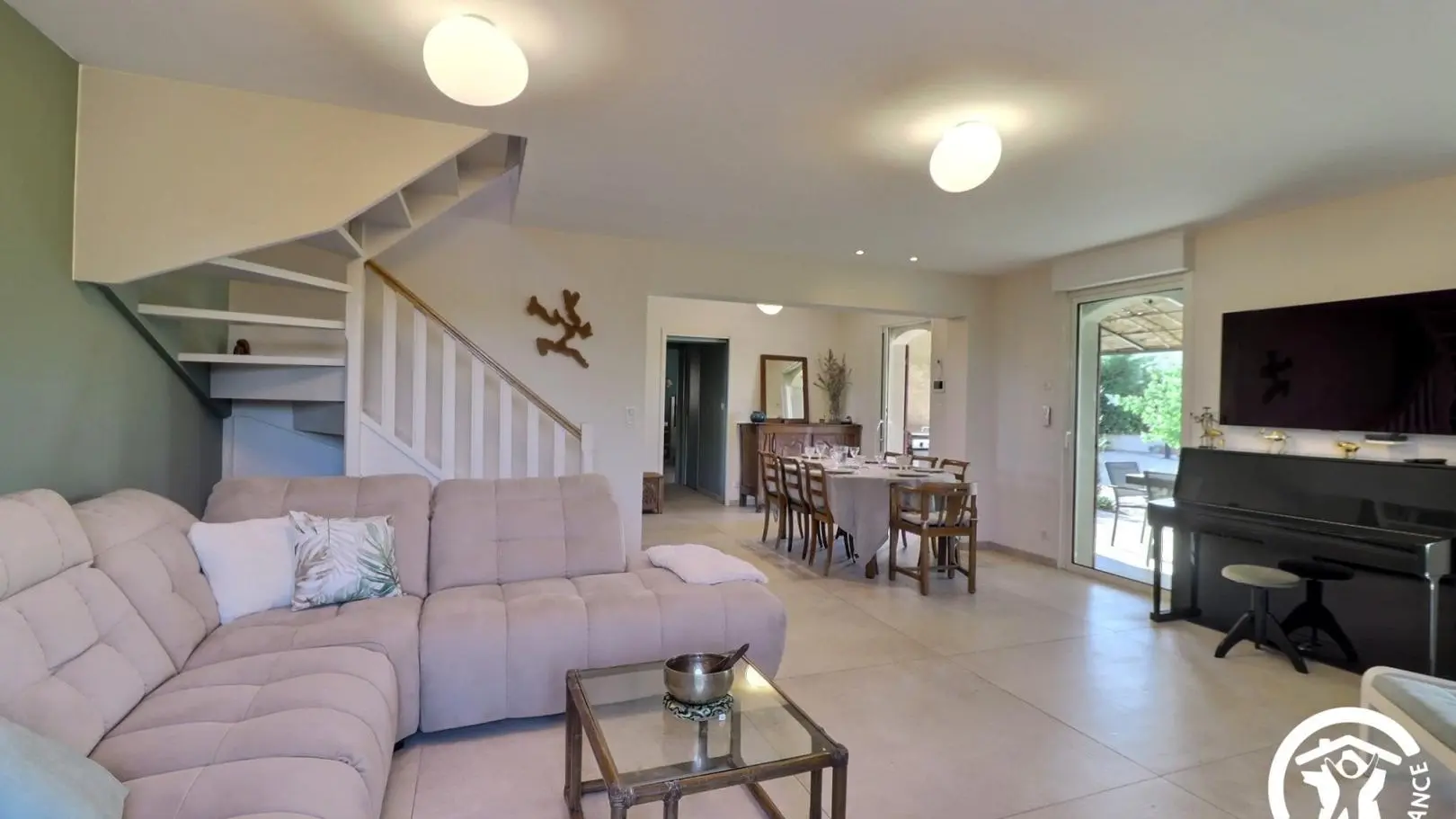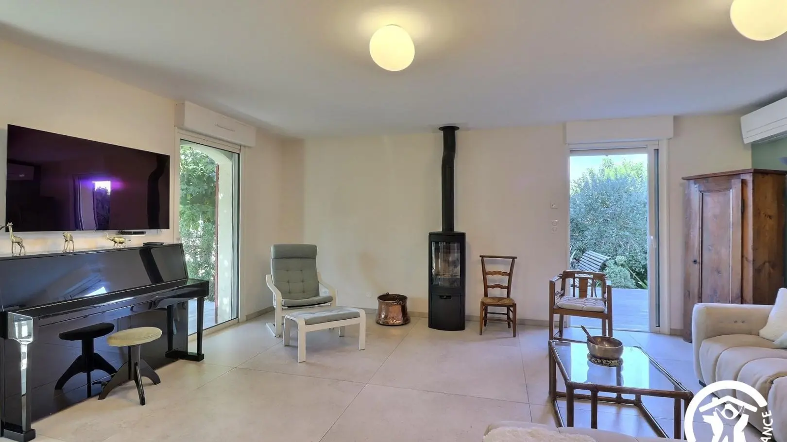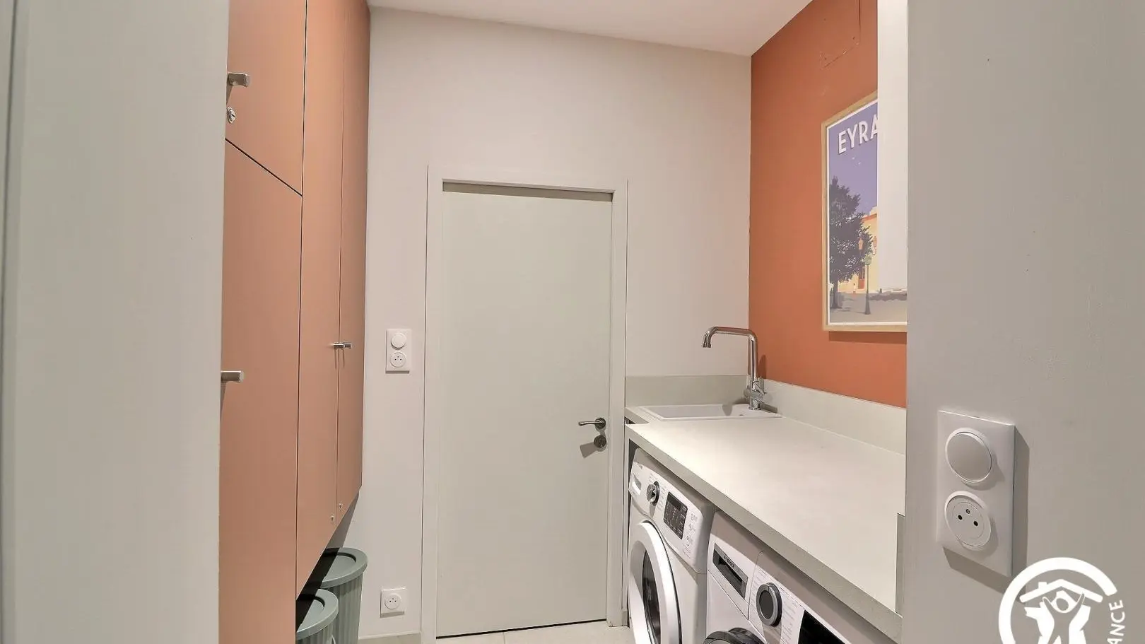- a fully equipped kitchen with an oven, induction hob, extractor hood, and fridge-freezer, opening onto the living room with a sofa, armchairs, TV, piano, and armchairs. - a laundry room with a washing machine and dryer