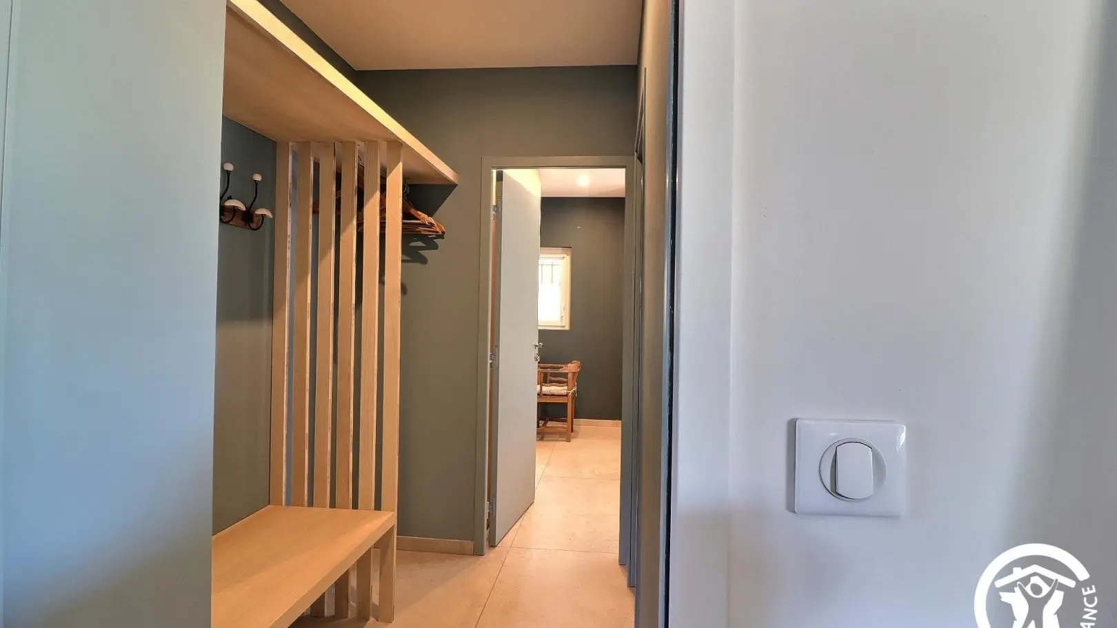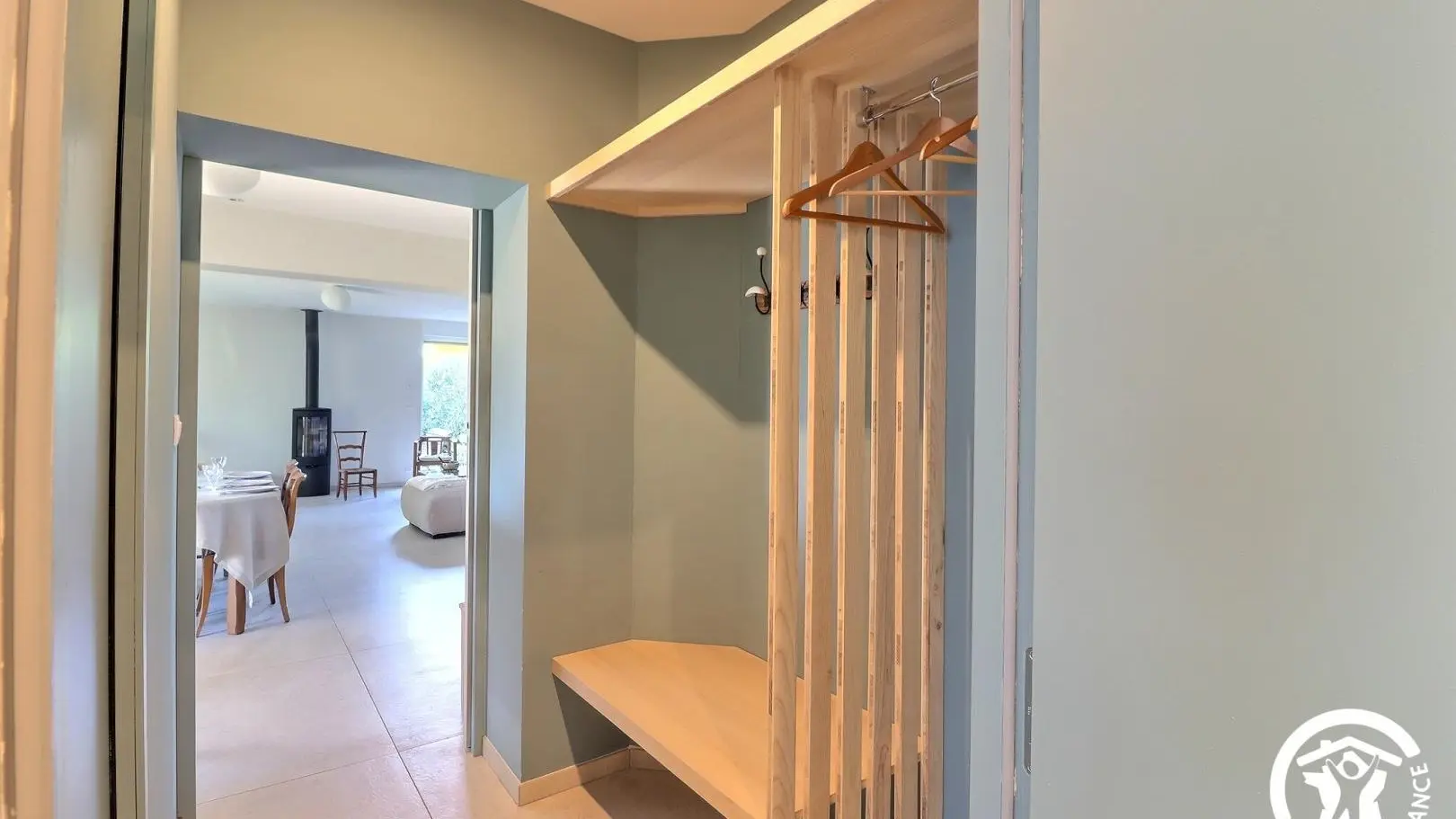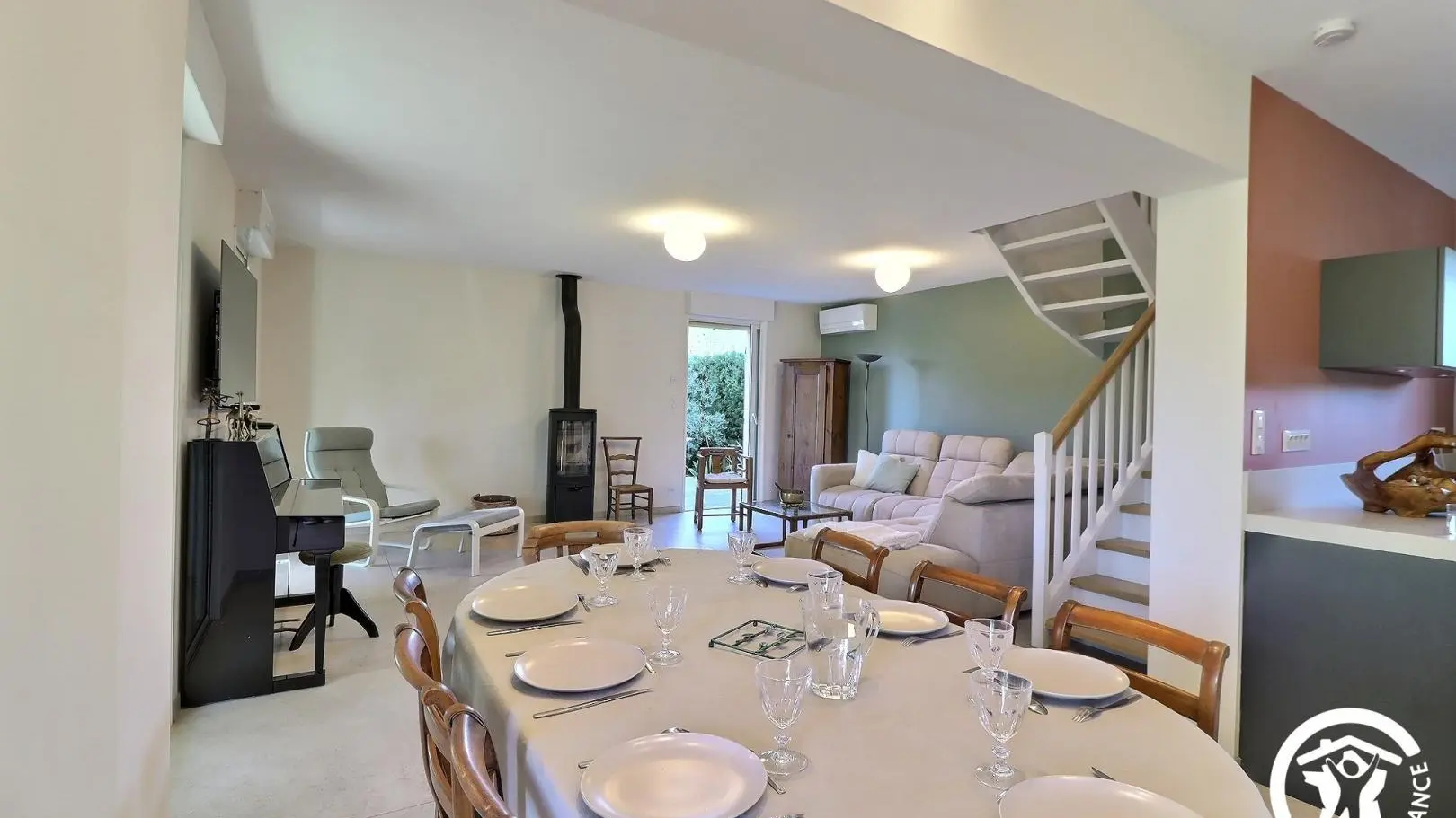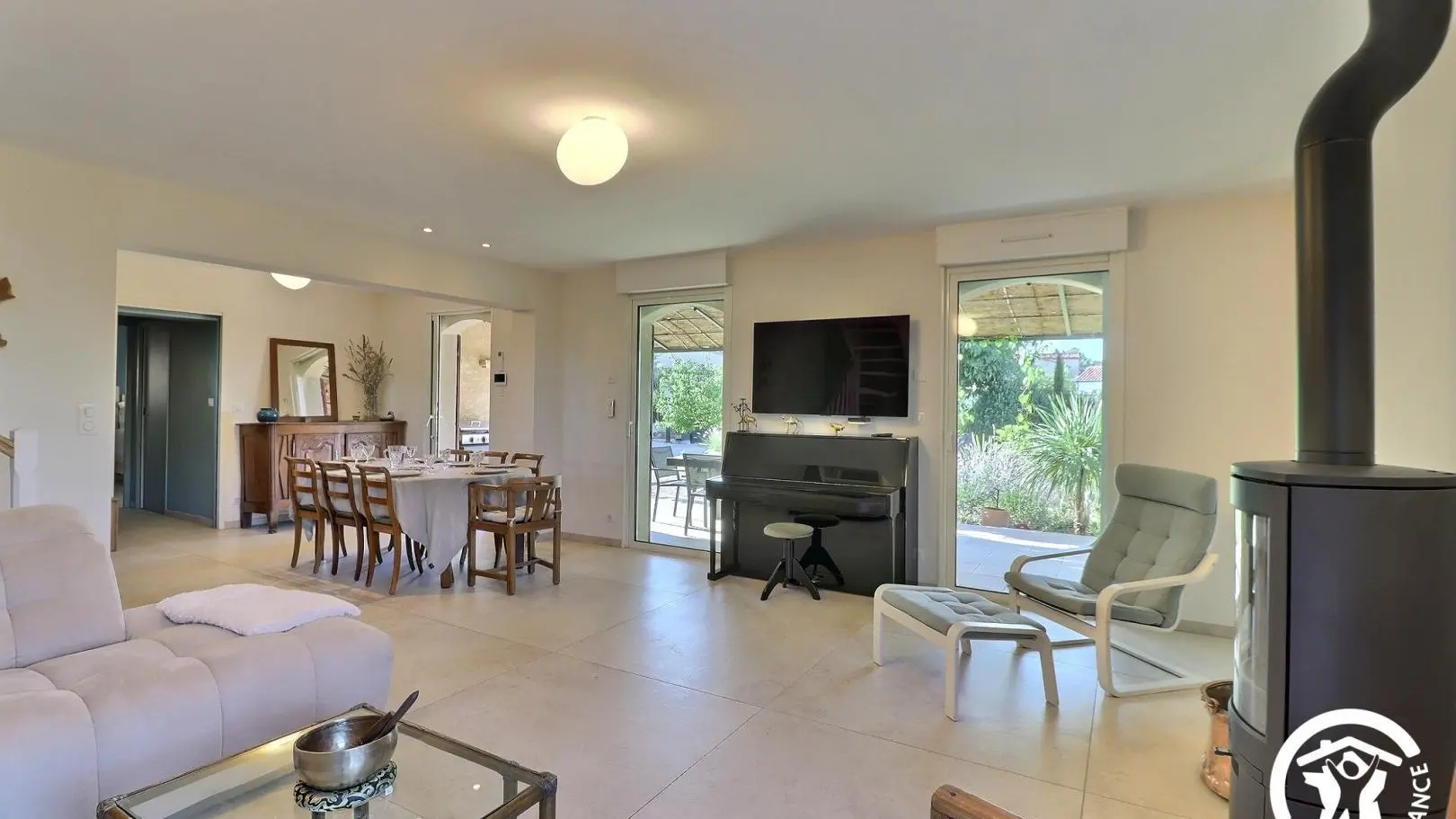 - a fully equipped kitchen with an oven, induction hob, extractor hood, and fridge-freezer, opening onto the living room with a sofa, armchairs, TV, piano, and armchairs. - a laundry room with a washing machine and dryer