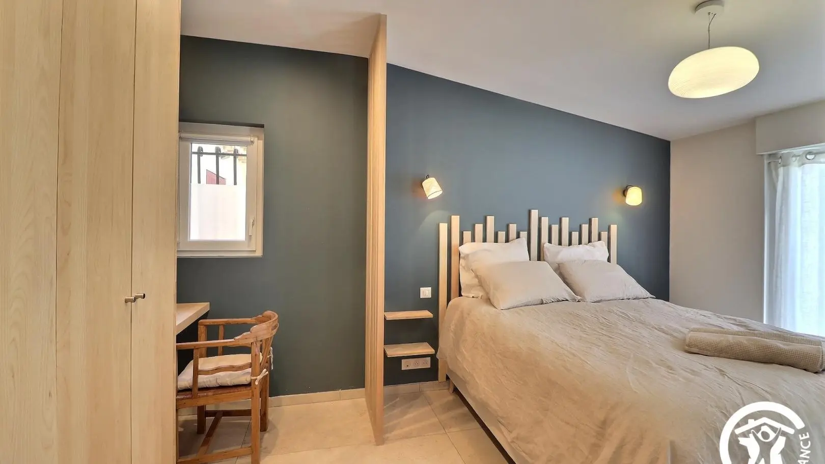 - a bedroom with two 80x200 cm twin beds, a desk, and a closet