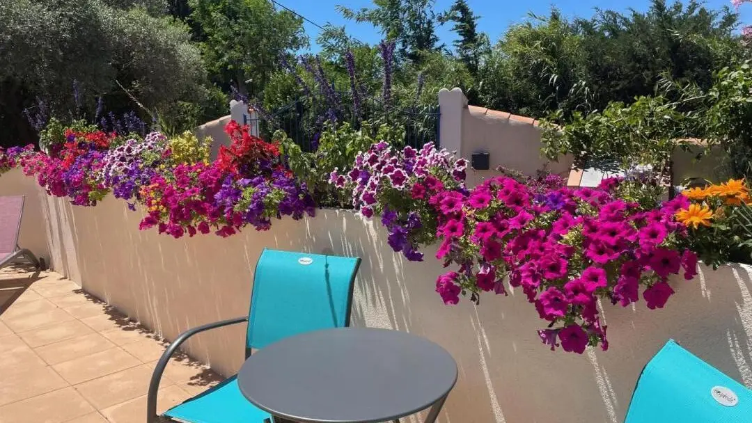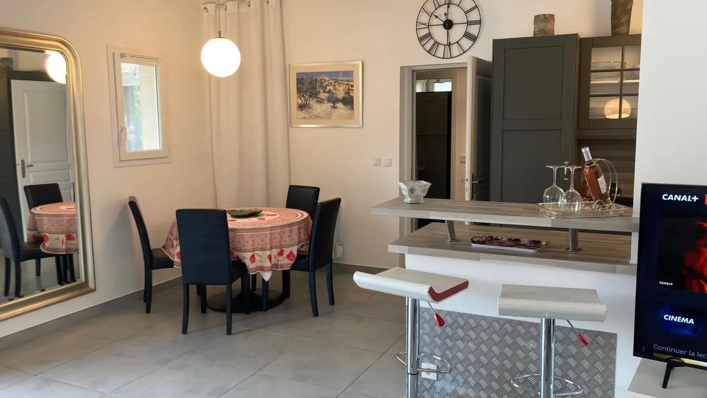In the countryside but only 1 km from the city center of Eyragues, pretty independent gîte for 4 people with 2 bedrooms. Another gîte and owners' accommodation on the same site. Very nice open view over the countryside on the estate, view of the Montagnette to the west and the Palais des Papes to the northwest. Access to the gîte via the private shaded terrace of 19 m² with its garden furniture. On one level, the gîte is composed of:
