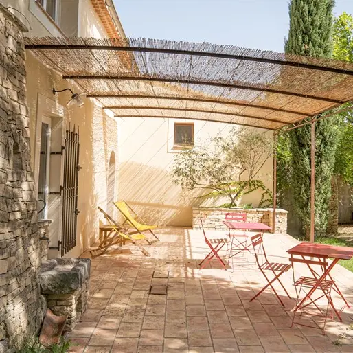 1) Lavender: located in an independent annex, this large room of 47 m² with private terrace of 65 m² full of charm with fountain will delight you. With a capacity of 3 people, it is composed of a 160x200cm bed and a 90x200cm bed. Relaxation armchair, connected flat screen TV, reversible air conditioning. Beautiful bathroom with very large walk-in shower 95x230cm, double sink and heated towel rail. WC closed. Wireless.