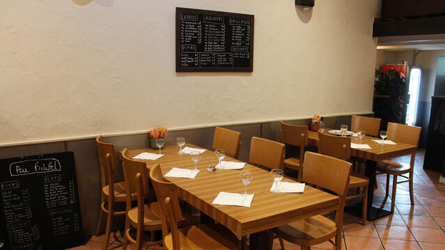 Mediterranean specialties (hummus, tehina, falafel, schawarma in sandwiches, pitas or platters) and Oriental (grilled peppers, keftas, kebbab and shish kebab). Hot dishes and mixed salads.
