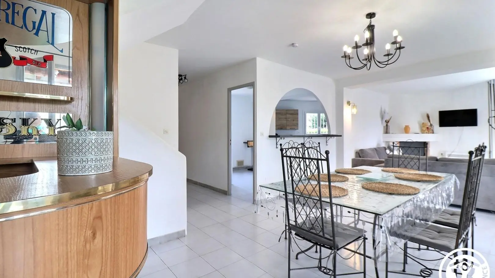 - Un 1er salón/comedor con sofás, TV de pantalla plana, chimenea ornamental, zona comedor para 6 personas y barra.
