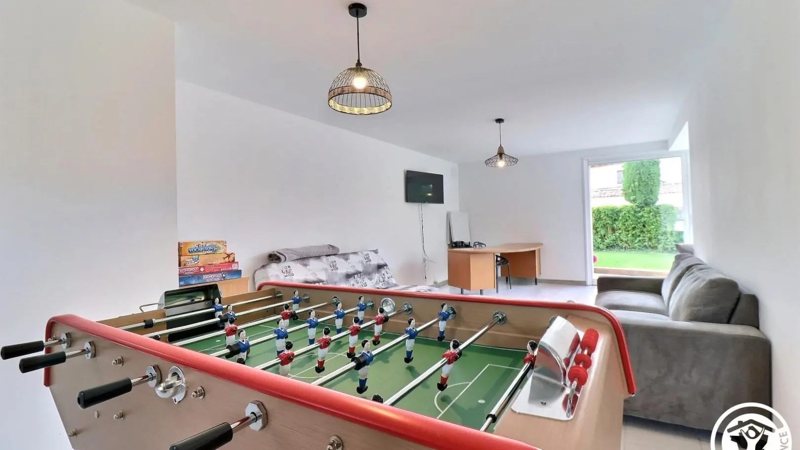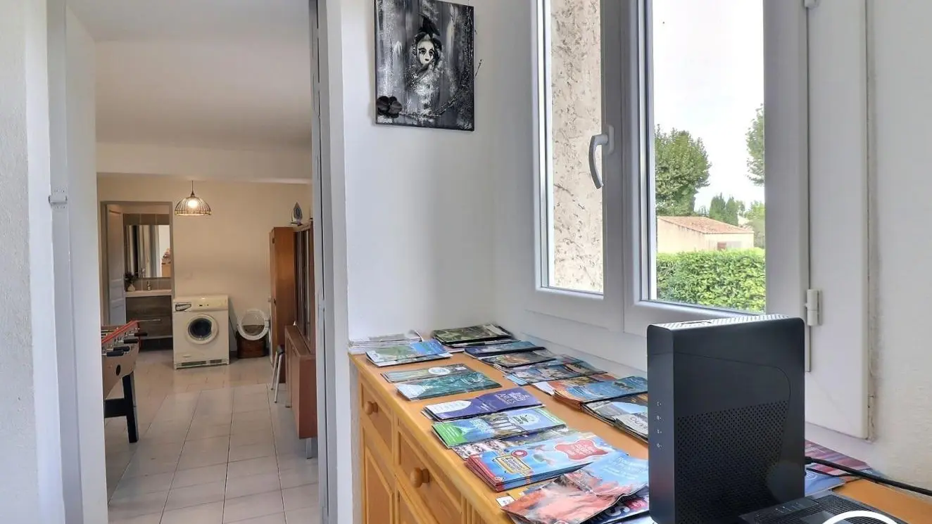 - Un segundo salón con amplio escritorio, sala de estar con sofá y TV de pantalla plana, futbolín, lavadora y secadora.