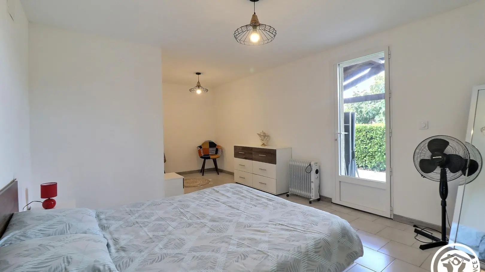 - Un 1er dormitorio con 1 cama de 160x200cm, pequeña sala de estar con sillones y mesa de café y ventana francesa que da al jardín.