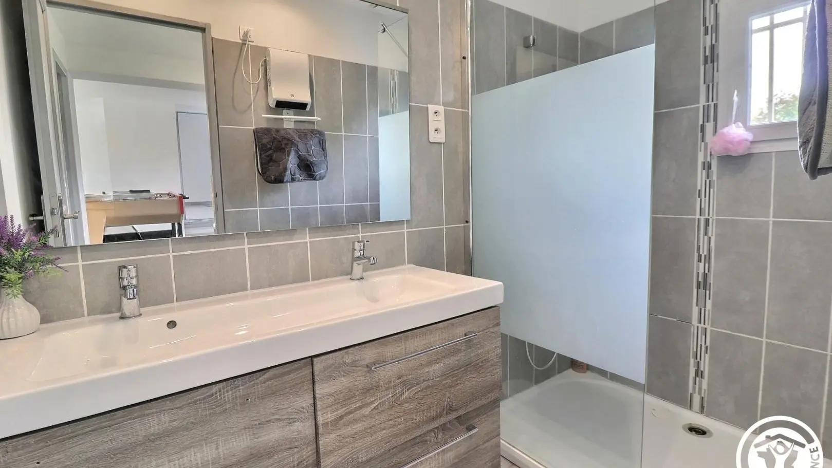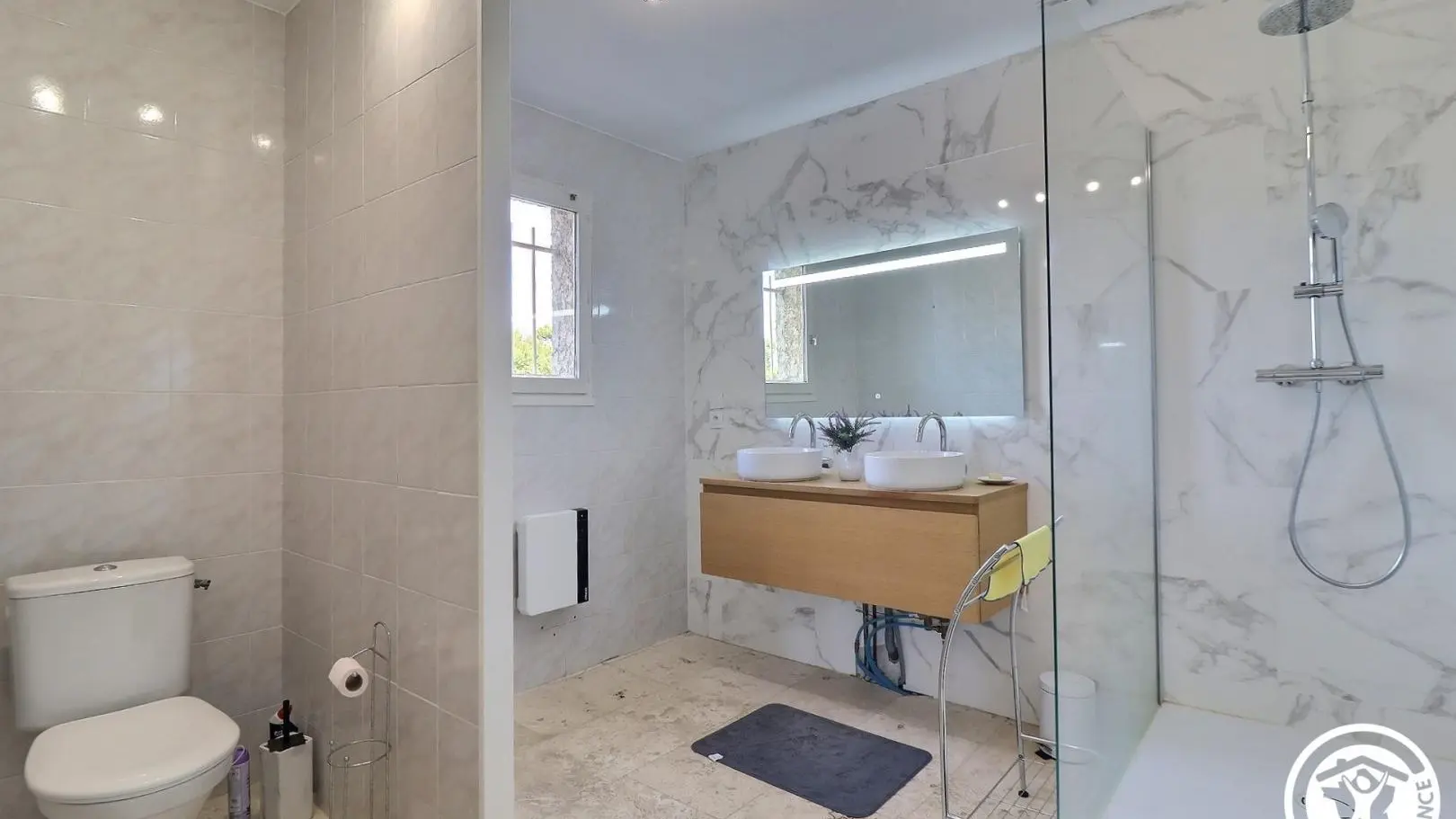 - Cuarto de baño con doble lavabo, amplia ducha a ras de suelo, 2 toalleros y WC.
