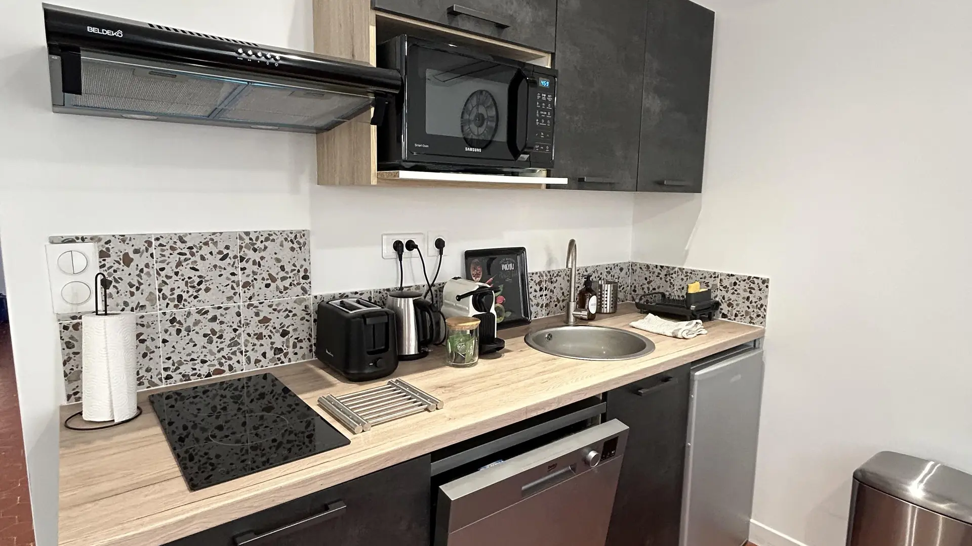 - Una cocina totalmente equipada (frigorífico-congelador, placa de cocina, hervidor, lavavajillas, cafetera Nespresso, vajilla y accesorios de cocina, etc.),