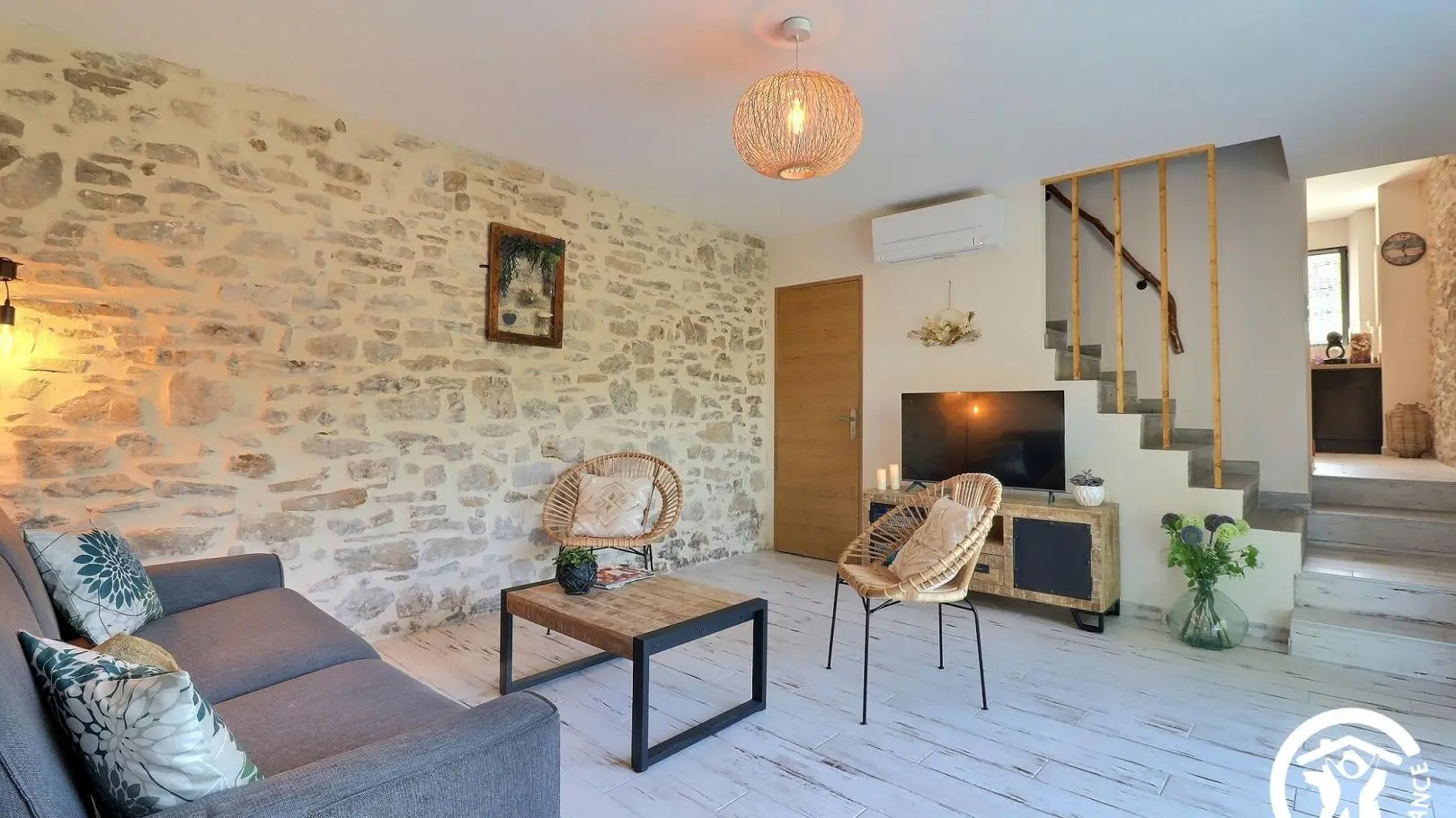 - una sala de estar con paredes de piedra vista: sofá, sillones, mesa de centro, TV de pantalla plana conectada. Ventanal con vistas al exterior. WC independiente con lavabo.