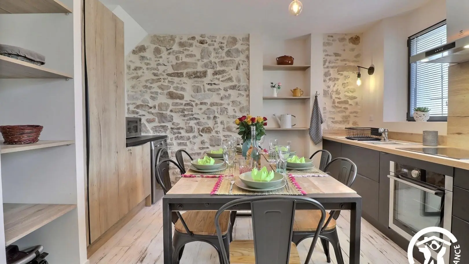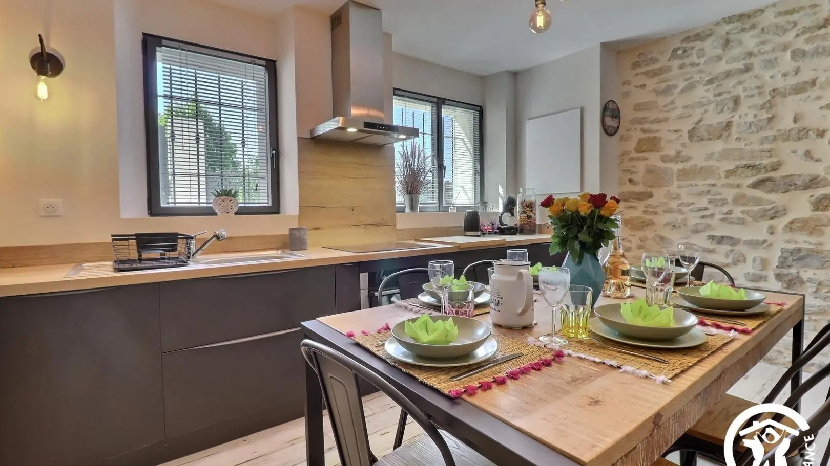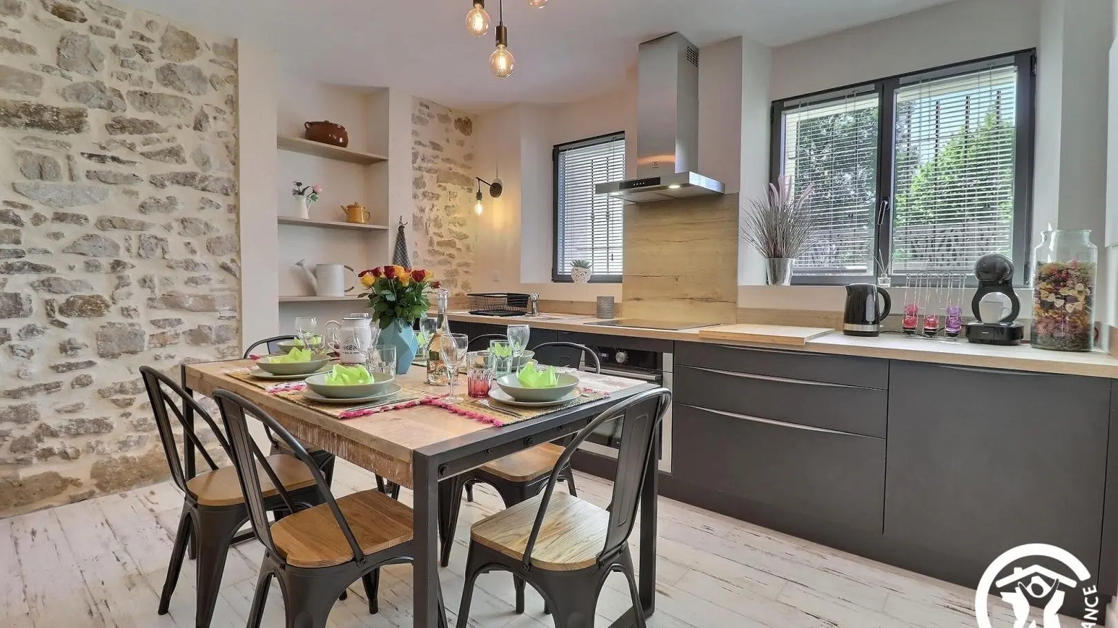 - una cocina accesible por 4 escalones: equipada con lavavajillas, horno, microondas, 3 fuegos de inducción, campana extractora, lavadora, frigorífico, congelador, mesa con 6 sillas.